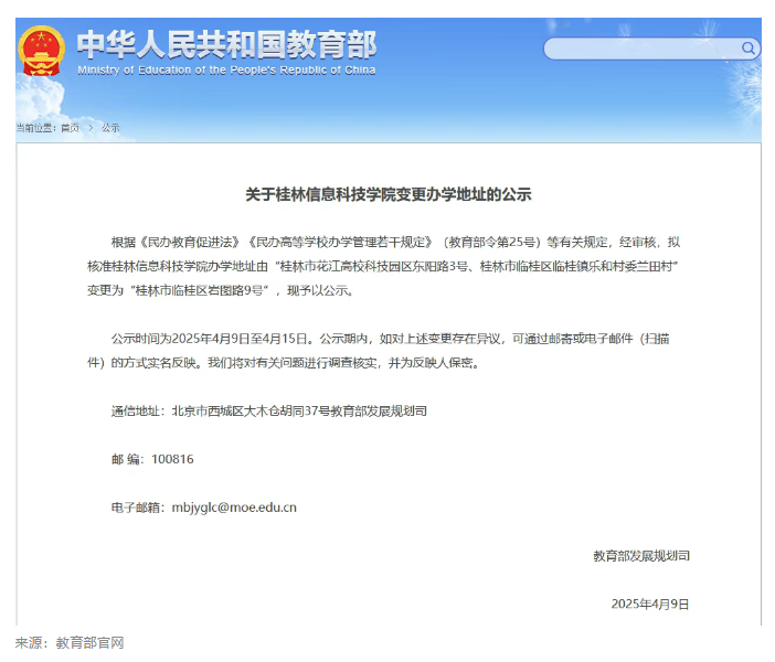 4月9日,教育部发展规划司发布公示,经审核,拟核准桂林信息科技学院办学地址由“桂林市花江高校科技园区东阳路3号、桂林市临桂区临桂镇乐和村委兰田村”变更为“桂林市临桂区岩图路9号”,现予以公示。