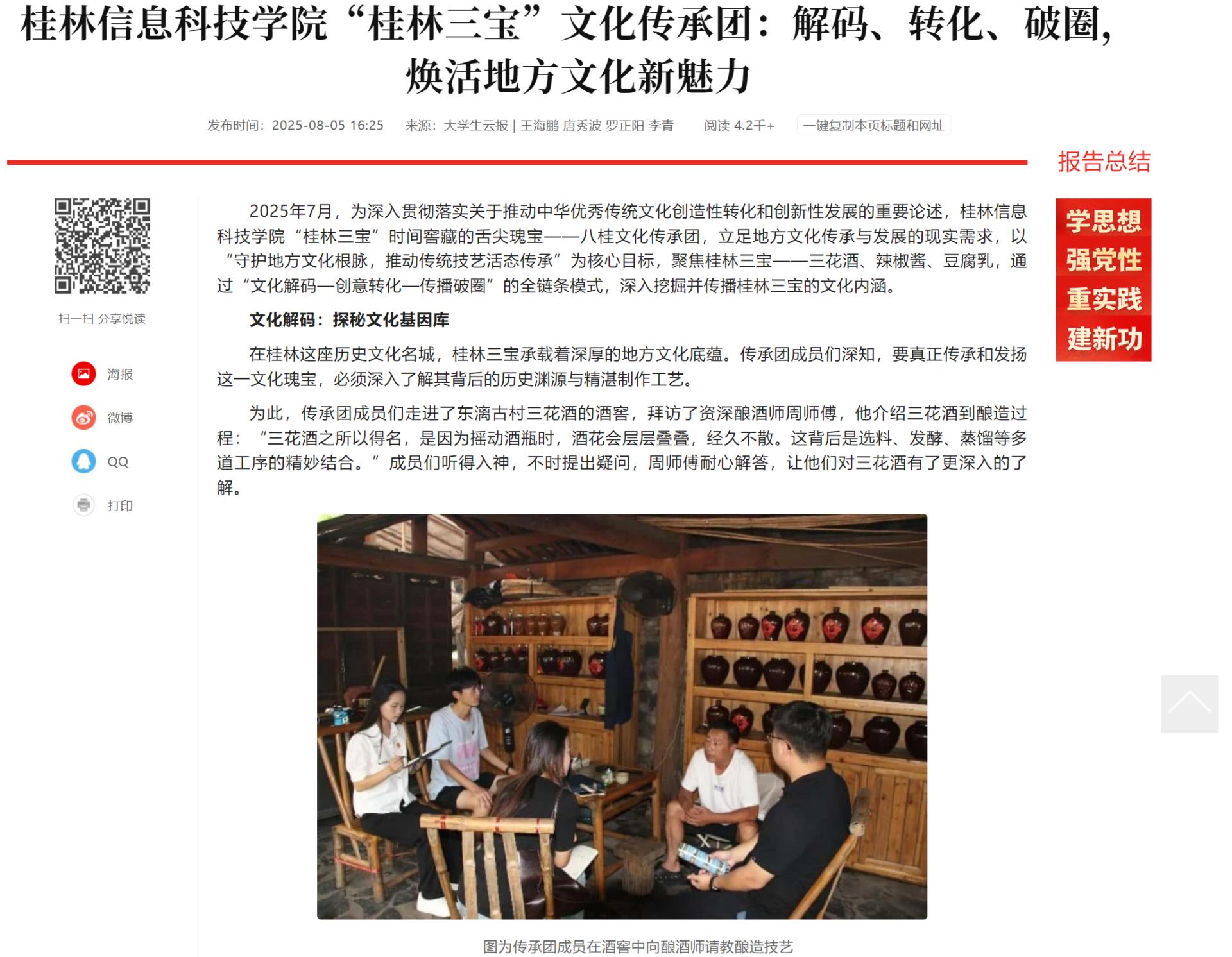 2025年7月,为深入贯彻落实关于推动中华优秀传统文化创造性转化和创新性发展的重要论述,桂林信息科技学院“桂林三宝”时间窖藏的舌尖瑰宝——八桂文化传承团,立足地方文化传承与发展的现实需求,以“守护地方文化根脉,推动传统技艺活态传承”为核心目标,聚焦桂林三宝——三花酒、辣椒酱、豆腐乳,通过“文化解码—创意转化—传播破圈”的全链条模式,深入挖掘并传播桂林三宝的文化内涵。