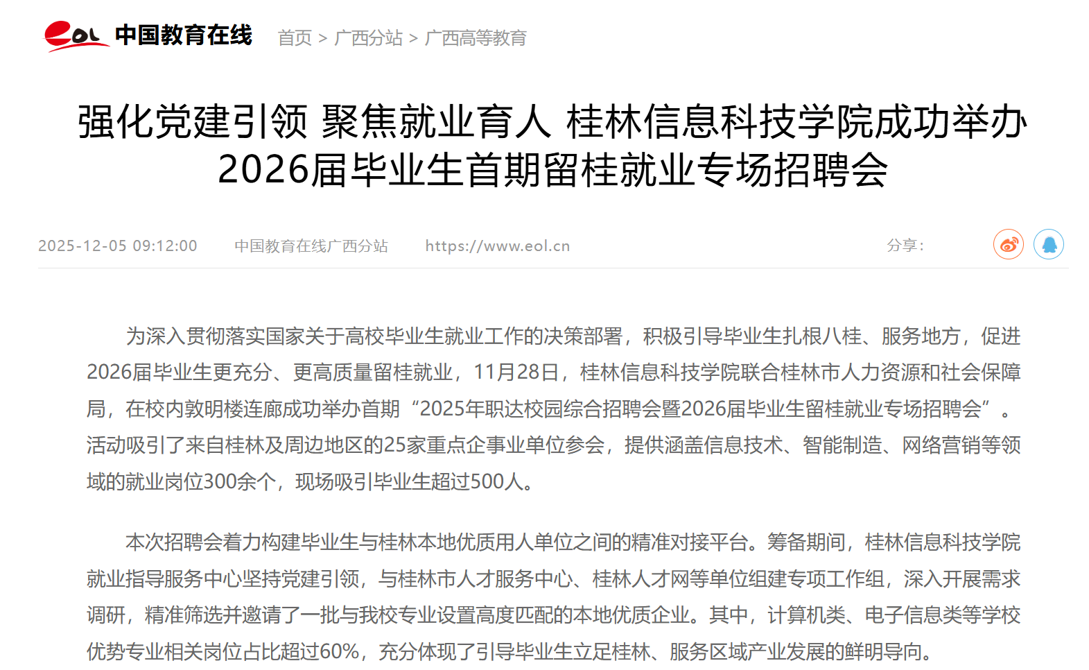 中国教育在线:强化党建引领 聚焦就业育人 桂林信息科技学院成功举办2026届毕业生首期留桂就业专场招聘会