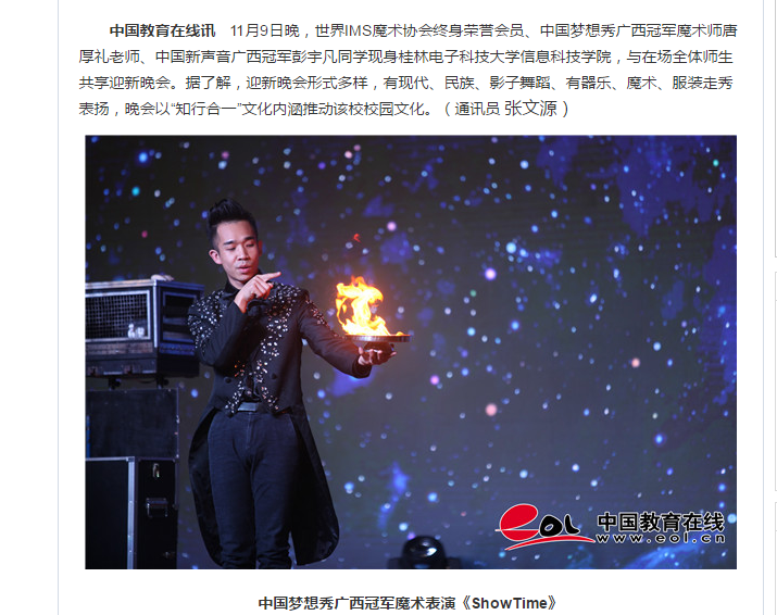 中国教育在线:广西顶级魔术、歌唱冠军现身桂林高校与师生共享新生晚会