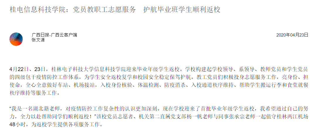 广西日报:桂电信息科技学院党员教职工志愿服务,护航毕业班学生顺利返校