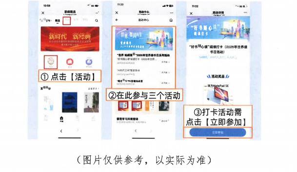 点击顶部【活动】进入后即可参与阅读打卡、留言活动、PK答题活动。