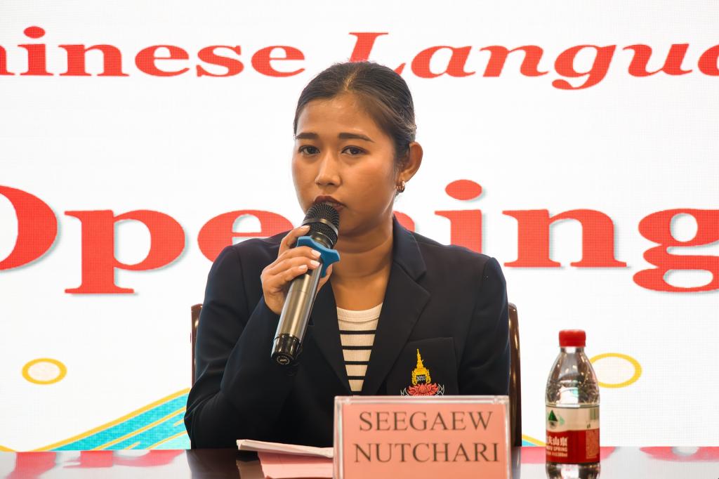 仪式最后,泰方教师代表玛哈普塔拉皇家女子中学教师SEEGAEW NUTCHARI用中文致辞。她对我校提供的这次留学机会表示衷心的感谢,并表明自己将在未来一个半月的留学时间里不断提升自身素质、开展文化交流,共同谱写好“中泰一家亲”的美好篇章。
