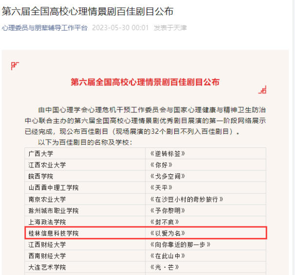 5月30日,第六届全国高校心理情景剧大赛百佳剧目公布,由我校心理中心王利南、罗慧芳、张承宗、石东升等老师联袂指导,校大学生艺术团及大学生心理健康志愿者协会联合创作选送的大学生原创心理情景剧作品《以爱为名》,经过网络初赛、组委会专家评审和大众评选团评分形成综合成绩后,成功入选百佳剧目。