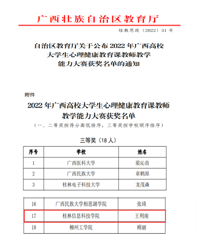 为进一步加强新时代大学生心理健康教育课程建设,近日,由自治区党委教育工委、自治区教育厅主办,广西师范大学承办的2022年广西高校大学生心理健康教育课教师教学能力大赛圆满结束。我校大学生心理健康教育与咨询中心专职教师王利南荣获本次大赛三等奖。