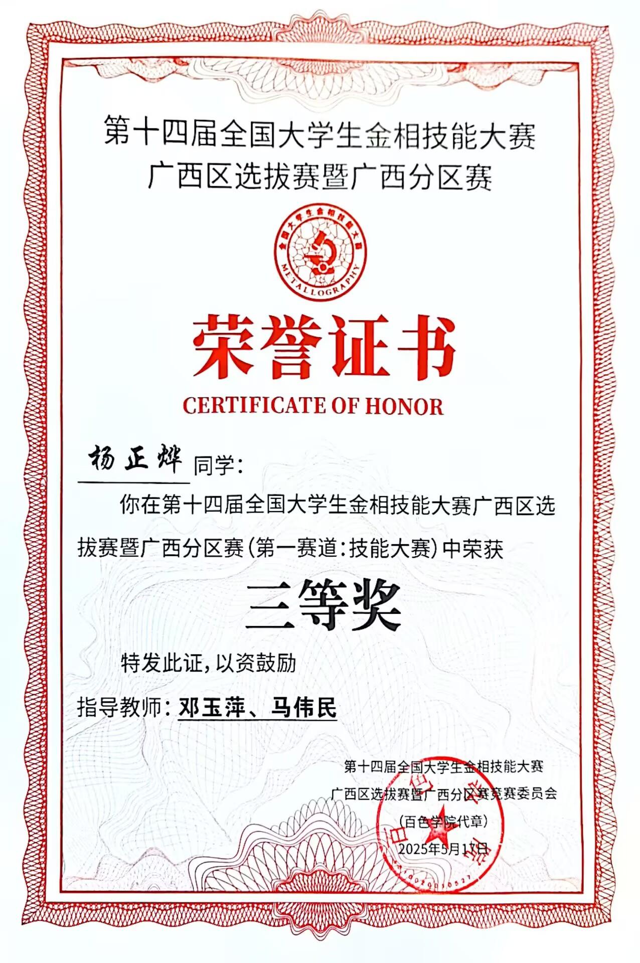 2025年5月16日-18日,第十四届全国大学生金相技能大赛广西区选拔赛在百色市举办,赛事由全国大学生金相技能大赛竞赛委员会指导、百色学院承办,吸引全区16所高校90余名选手参赛,聚焦材料学科专业技能与创新风采展示。