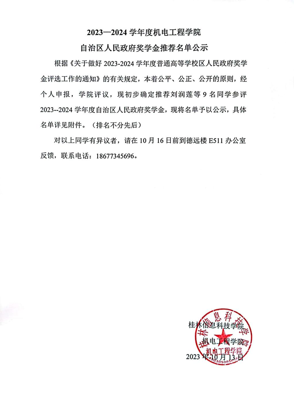 根据《关于做好2023-2024学年度普通高等学校区人民政府奖学金评选工作的通知》的有关规定,本着公平、公正、公开的原则,经个人申报,学院评议,现初步确定推荐刘润莲等9名同学参评2023--2024学年度自治区人民政府奖学金,现将名单予以公示,具体名单详见附件。(排名不分先后)