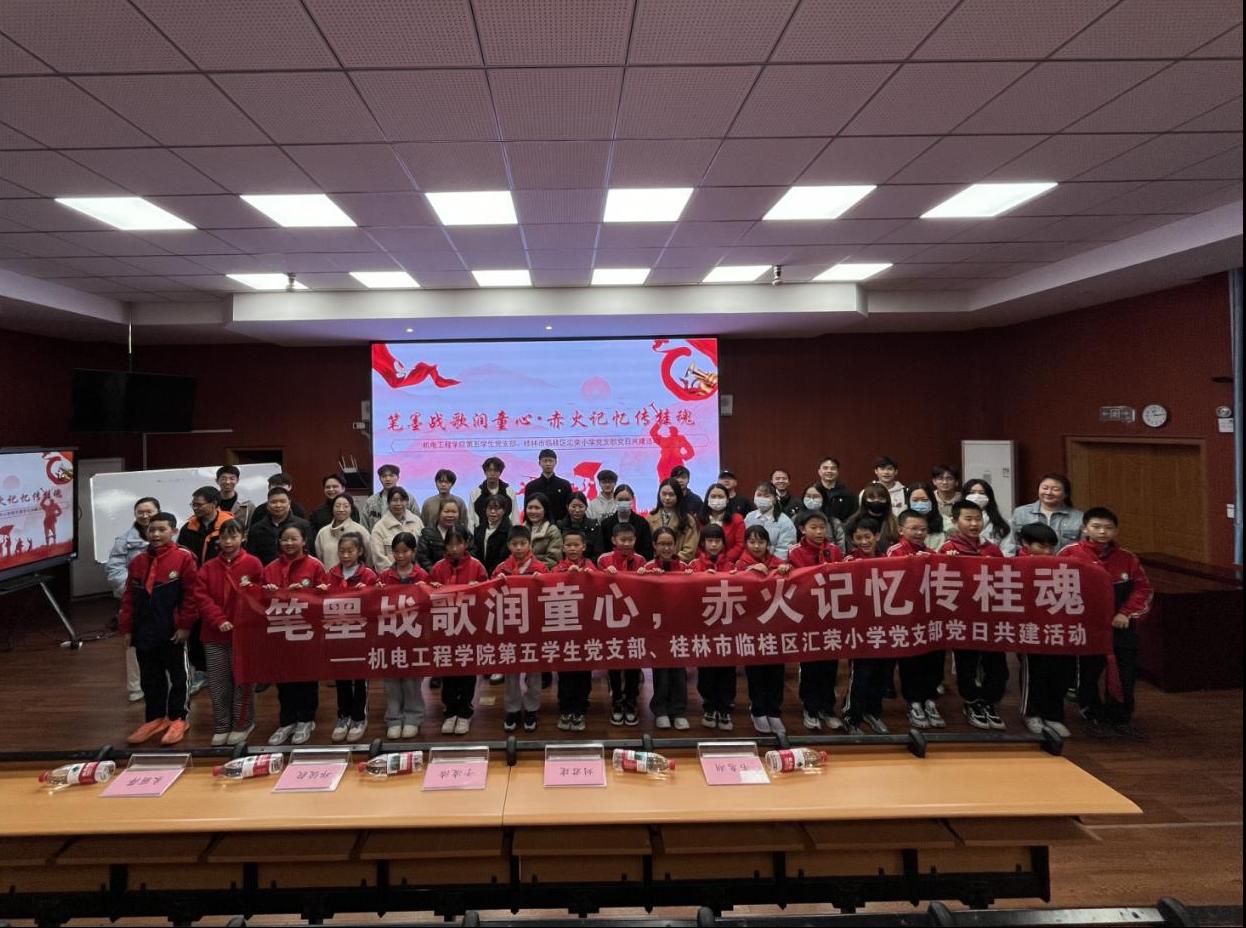 为深化校地党建共建,厚植青少年爱国主义情怀,挖掘桂林本土抗战文化资源,12月16日,机电工程学院第五学生党支部携手桂林市临桂区汇荣小学党支部,开展以“笔墨战歌润童心,赤火记忆传桂魂”为主题的党日共建活动,将桂林抗战文化城的红色故事带进五年级的课堂,为两校党支部搭建起红色教育联动的坚实桥梁。