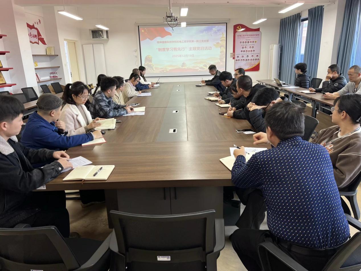 为严格落实《中国共产党党员教育管理工作条例》要求,强化党员教育管理的基础性作用,12月19日,机电工程学院第一教工党支部在J706开展“制度学习我先行”主题党日活动,主要围绕学习“三会一课”和“组织生活会”两个方面展开。支部全体党员参加活动,活动由党支部副书记韦秋红同志主持。