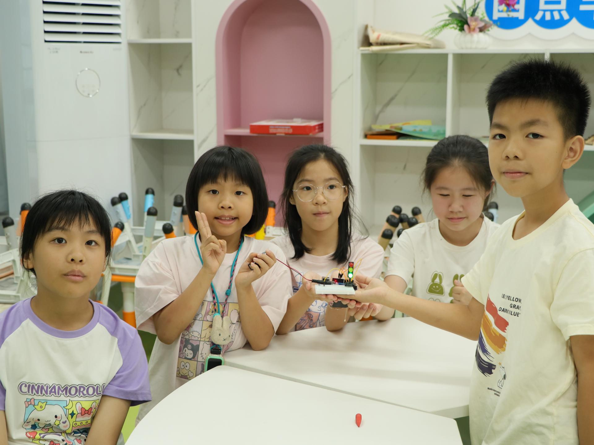 课程设置延续了科技实践特色,各板块亮点纷呈:Arduino 课程以交通红绿灯为原型,引导孩子们学习循环结构与条件判断语句,通过编写程序控制三色 LED 灯的亮灭时序,模拟真实红绿灯切换逻辑;Scratch 课程融入运动轨迹设计与条件判断指令,鼓励孩子们发挥想象设计游戏场景与互动规则,在趣味编程中锻炼反应逻辑与创造力;3D打印课程聚焦正多面体结构,指导孩子们用3D打印笔搭建方体,探索几何体构造原理,在操作中掌握材料挤出速度、冷却时间等变量控制,提升空间认知与动手能力;科普实验课程的 “一封密信” 实验则掀起课堂高潮,孩子们在亲手完成密信书写与显现的过程中,不仅了解了背后的科学原理,更激发了对科学知识的浓厚好奇心。