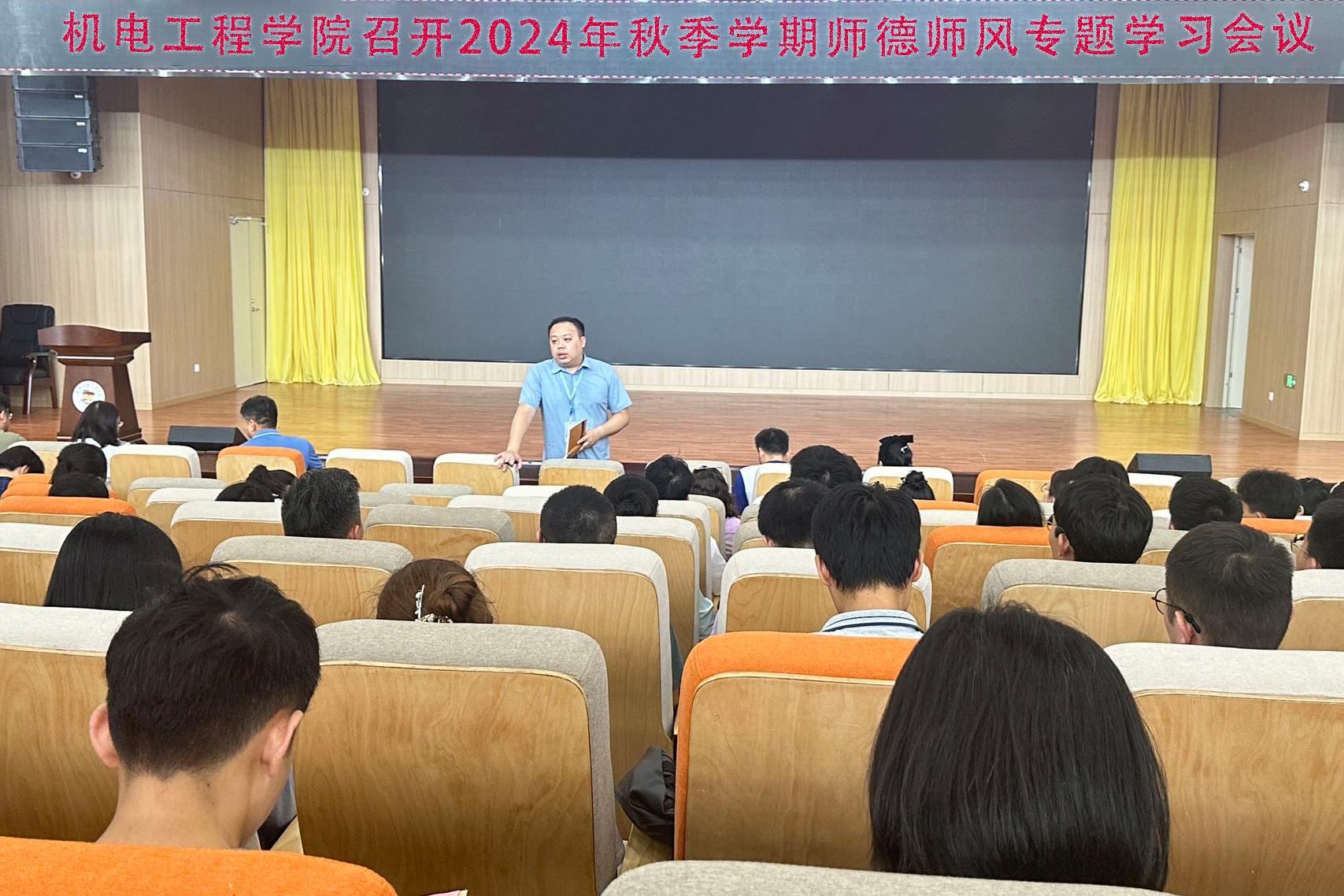 为加强我院师德师风建设,营造风清气正的教育氛围,增强立德树人的责任感和使命感,8月26日中午,机电工程学院在F107报告厅召开2024年秋季学期师德师风专题学习会议。本次会议由学院党委书记文超主持,学院全体教职工参加本次会议。