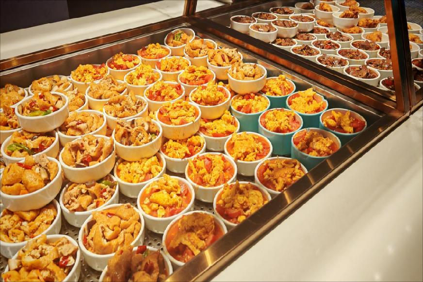 食堂大楼总建筑面积19729㎡,内设三层餐厅,涵盖110余个档口及自助餐,食材卫生安全,品类丰富,可提供定制化套餐。