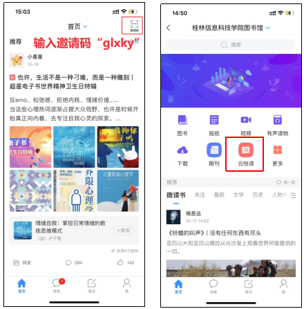 3、登录后在首页右上角输入邀请码glxky,即可进入桂林信息科技学院首页,首页点击“云悦读”模块即可进入参与图书阅读活动;