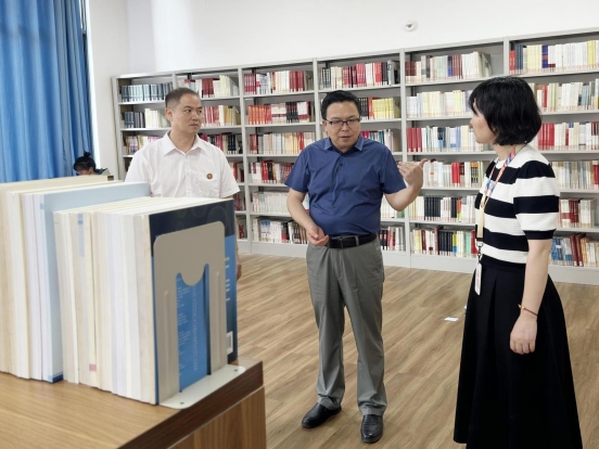 捐书活动后,甘书记到图书馆主题阅读区进行调研,对图书馆工作表示肯定,并对今后的规划建设进行指导。