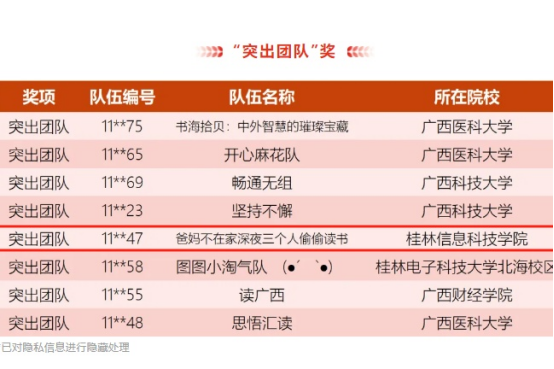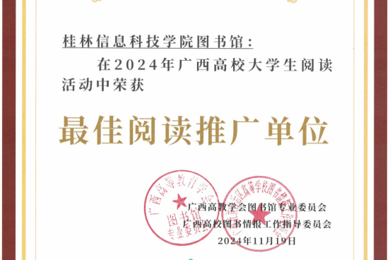 近日,2024年广西高校大学生阅读活动圆满结束,我校图书馆组织全校学生积极参加活动,荣获最佳阅读推广单位,广大学生阅读热情高涨,2个团队分获“突出团队”奖和“优秀团队”奖,2名学生荣获“阅读之星”奖。