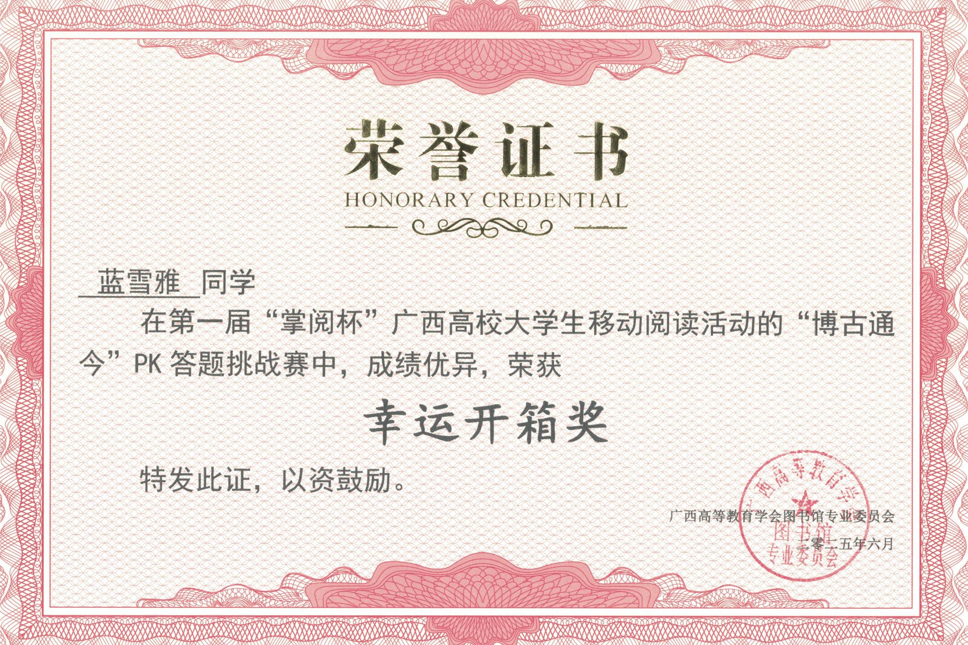 近日,第一届“掌阅杯”广西高校大学生移动阅读活动圆满落下帷幕,我校学子积极参加活动,其中蓝雪雅同学在活动“博古通今”PK答题挑战赛中,成绩优异,喜获“幸运开箱奖”。