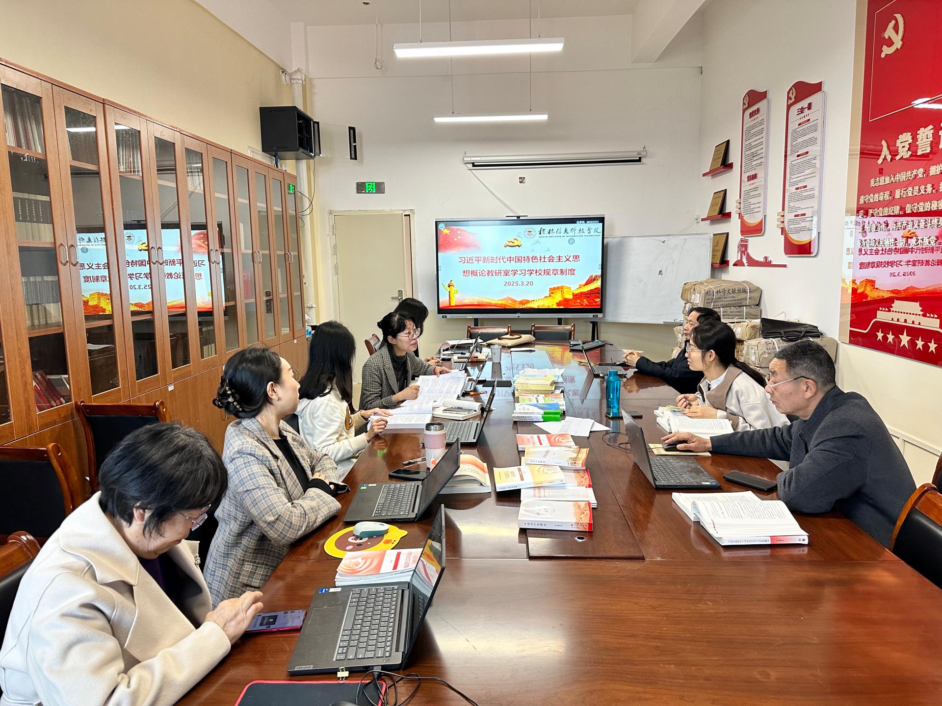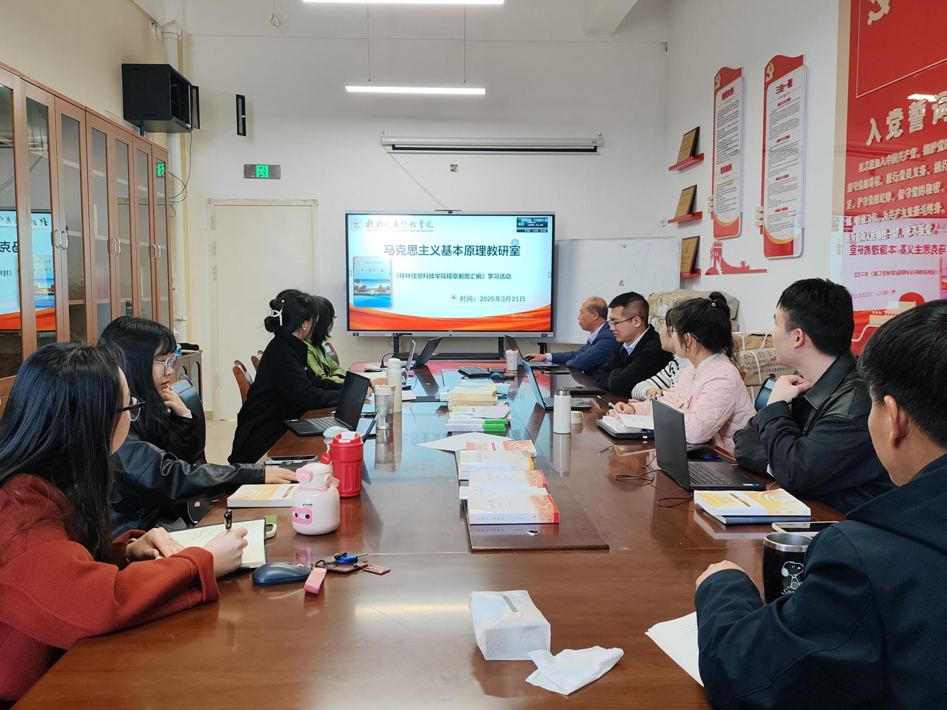 为深入推进“制度学习我先行”主题党日活动,马克思主义学院于3月15日至23日开展了一系列学习活动,旨在深化教职工对学校规章制度的理解,提升纪律意识和规范化工作水平。学院通过自学、教研室研讨和院会学习等多种形式,积极学习《桂林信息科技学院规章制度汇编》,确保全体教职工在制度学习中走在前列。