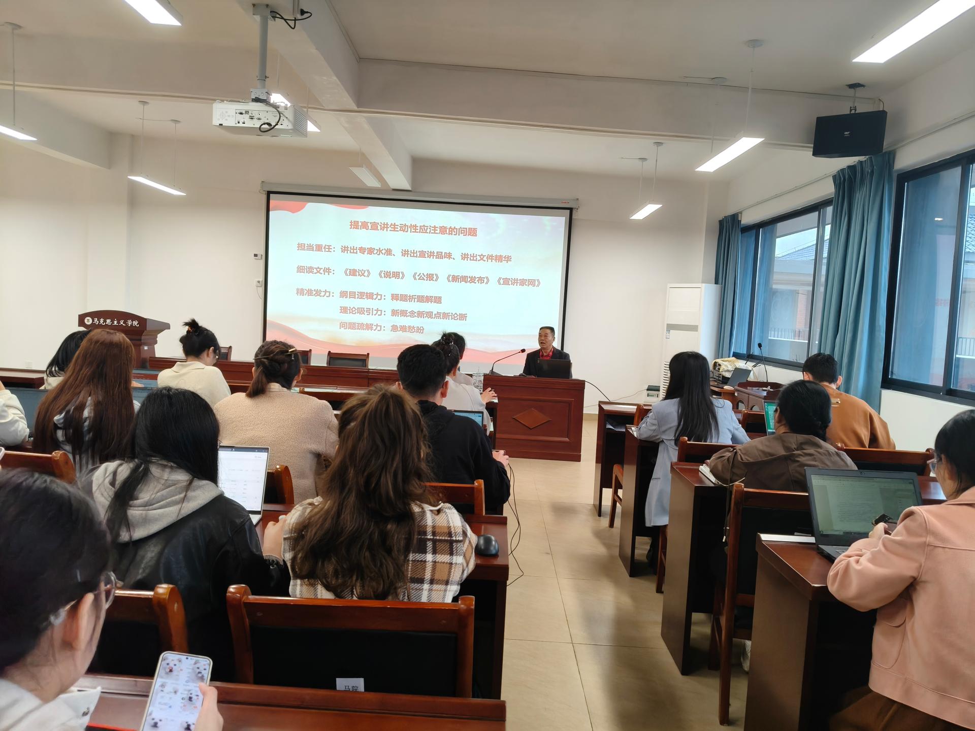 涂教授围绕“讲出专家水平、讲出宣讲品味、讲出文件精神”这一核心要求,结合其深厚的理论功底与丰富的宣讲经验,为宣讲团成员作了一场精彩辅导。他强调,面向校内基层的宣讲必须做到“有高度、有深度、有温度”:既要准确把握全会精神的核心要义,深入阐释新思想的理论逻辑,又要善于运用师生身边的鲜活案例,以小切口展现大主题,切实增强宣讲的吸引力和感染力。在互动环节,宣讲团成员就宣讲难点与涂教授展开深入交流。大家一致表示,涂教授的指导切中要害、针对性强,为接下来的宣讲工作指明了方向、理清了思路、增强了信心。