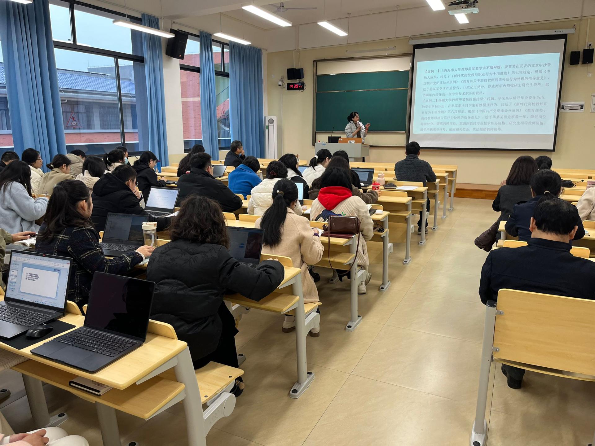 大会由马克思主义学院党总支书记赵奕老师领学,全体党员教师参加。赵奕老师通过案例分析、法规解读等形式,深入剖析违纪违法问题产生的根源和危害。她强调教职工要从中吸取教训,增强纪律观念和规矩意识。同时,也要加强党性修养,严格遵守党的纪律和各项规章制度,做到廉洁从教、廉洁从政。