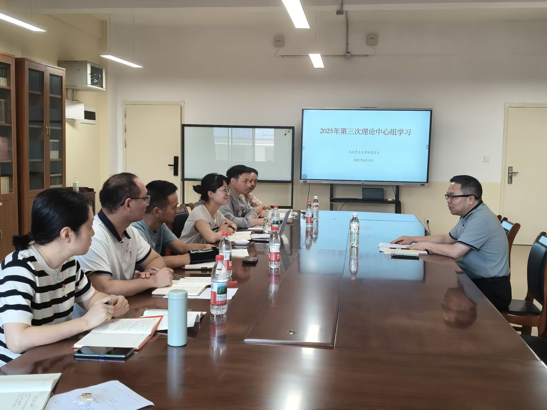 6月12日下午,马克思主义学院党总支理论学习中心组在G610会议室召开2025年第三次集中学习(扩大)会议,会议由党总支书记赵奕主持,党总支理论学习中心组成员及各党支部书记参加会议,学校党委书记甘勇列席旁听。