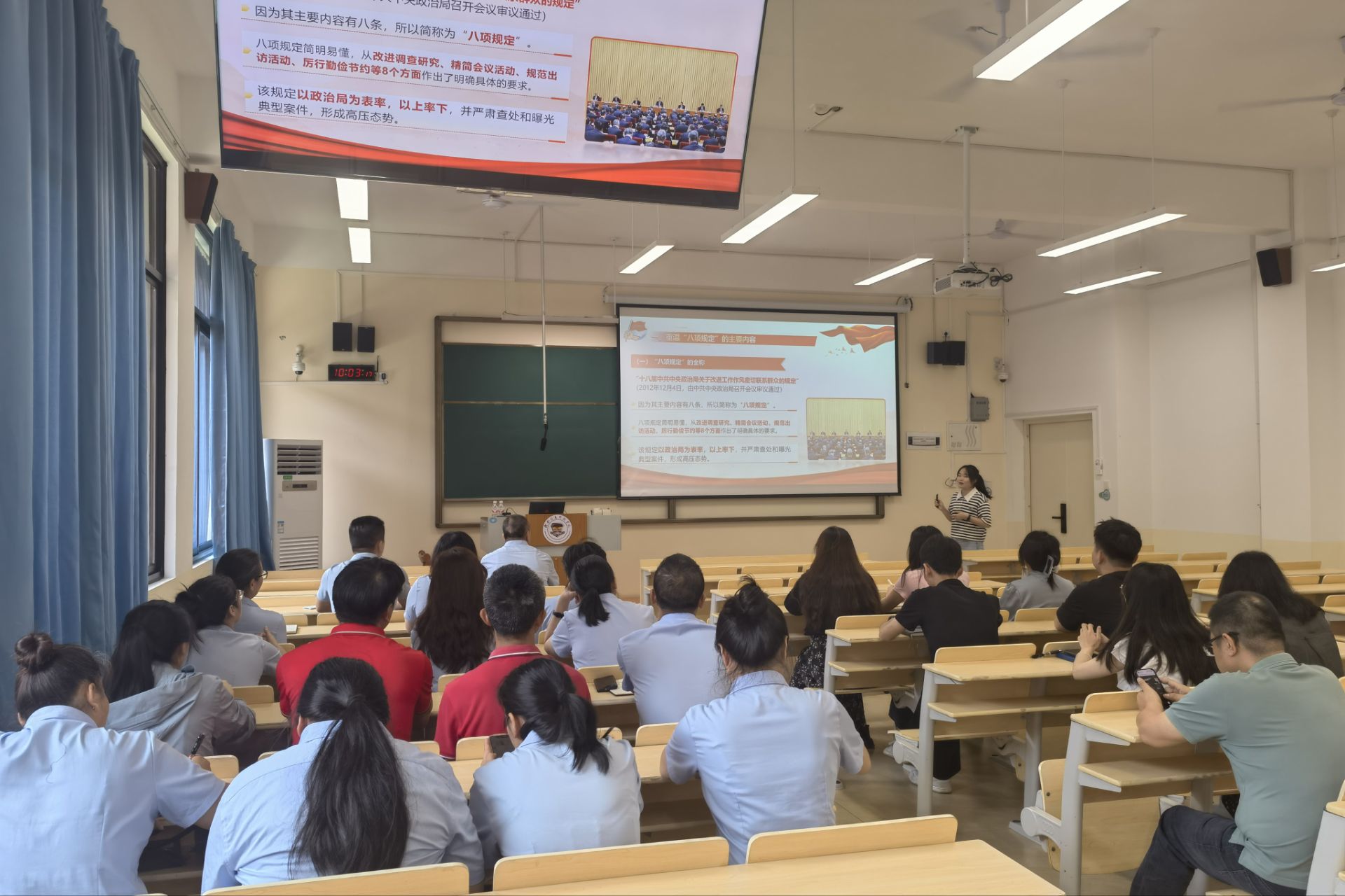 结对双方围绕“共学理论、共解难题”,实现理论宣讲与基层需求的精准对接。例如,宣讲团成员王硕老师与机电工程学院教工党支部结对,围绕“新质生产力与工科人才培养”主题,结合学院的科研方向解读“全国两会”中关于科技创新的决策部署。唐小艳老师则与商学院教工党支部结对,以“教师成长与党的作风建设”为切入点,引导教师党员在学术诚信和职业规划中践行初心使命。此外,在社区党支部的宣讲中,但玉梅老师围绕“深入贯彻中央八项规定精神学习教育与基层作风建设”主题,推动理论宣讲与基层治理的深度融合。
