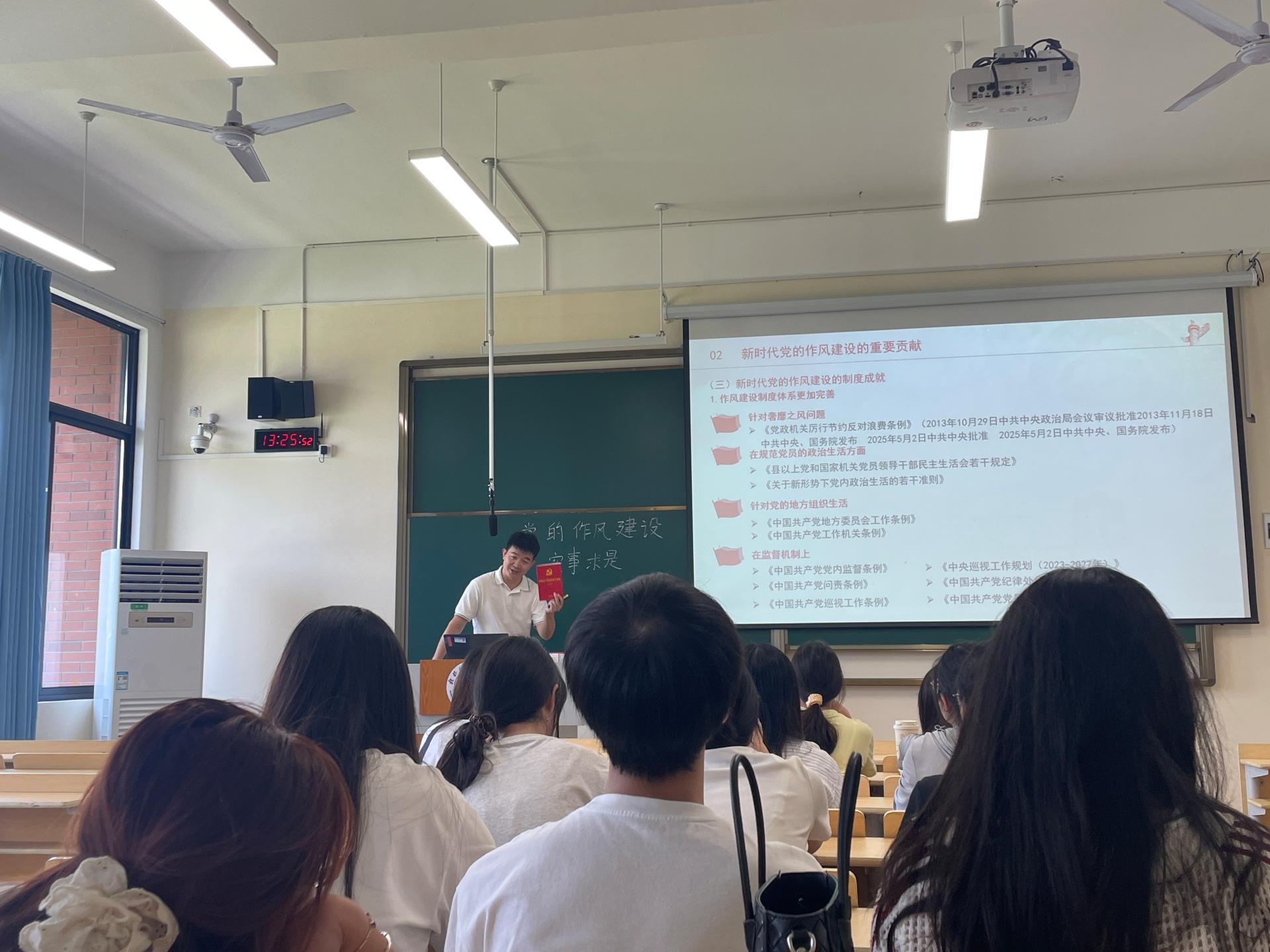 宣讲中,支部党员充分发挥专业优势,对党的创新理论进行了深入浅出的解读。例如,宁艺卓同志在外贸与外语学院第一学生党支部以“党的作风建设”为主题,列举了一系列正面典型与反面警示案例,引导学生党员在日常学习和工作中自觉践行优良作风。廖丽同志针对体育与健康学院的特点,以“体育赛事中的纪律规矩”为切入点,系统讲解中央八项规定精神在体育领域的贯彻落实。