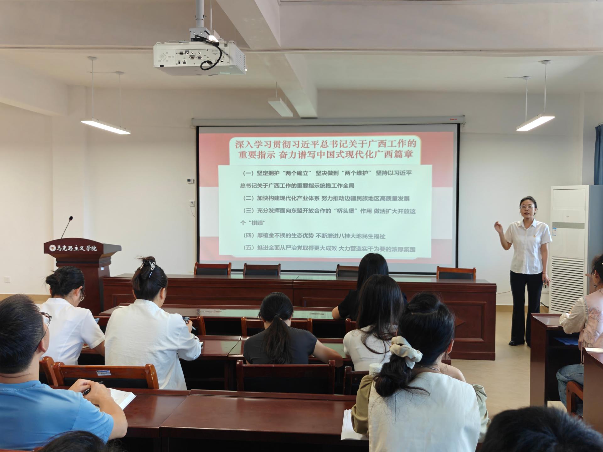 9月24日,马克思主义学院第二教工党支部在G605组织开展学习贯彻习近平总书记关于广西工作论述重要要求专题学习。本次学习由支部组织委员尹泽昕老师领学,全体党员教师参与。