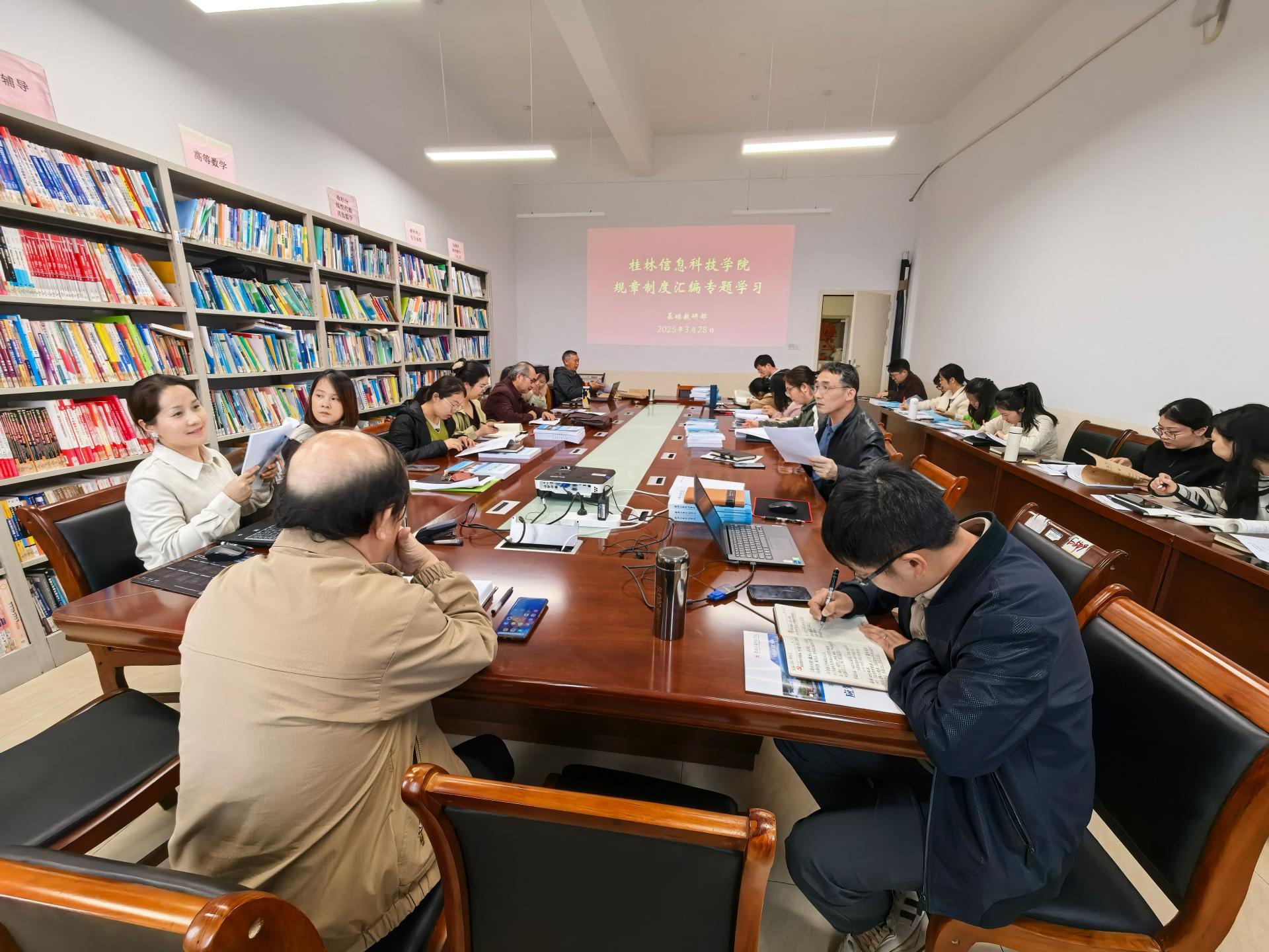 张主任聚焦《桂林信息科技学院规章制度汇编》,带领大家重点解读了有关教学管理、科研申报、人事考勤、财务报销等方面的管理制度。张主任着重强调了在日常管理中易出现的疏漏环节,旨在让部门每位教师都明晰管理制度,不犯错。张主任最后总结道:“制度是管理的基石,规范化运作需要每位同事知规守规、知行合一。”