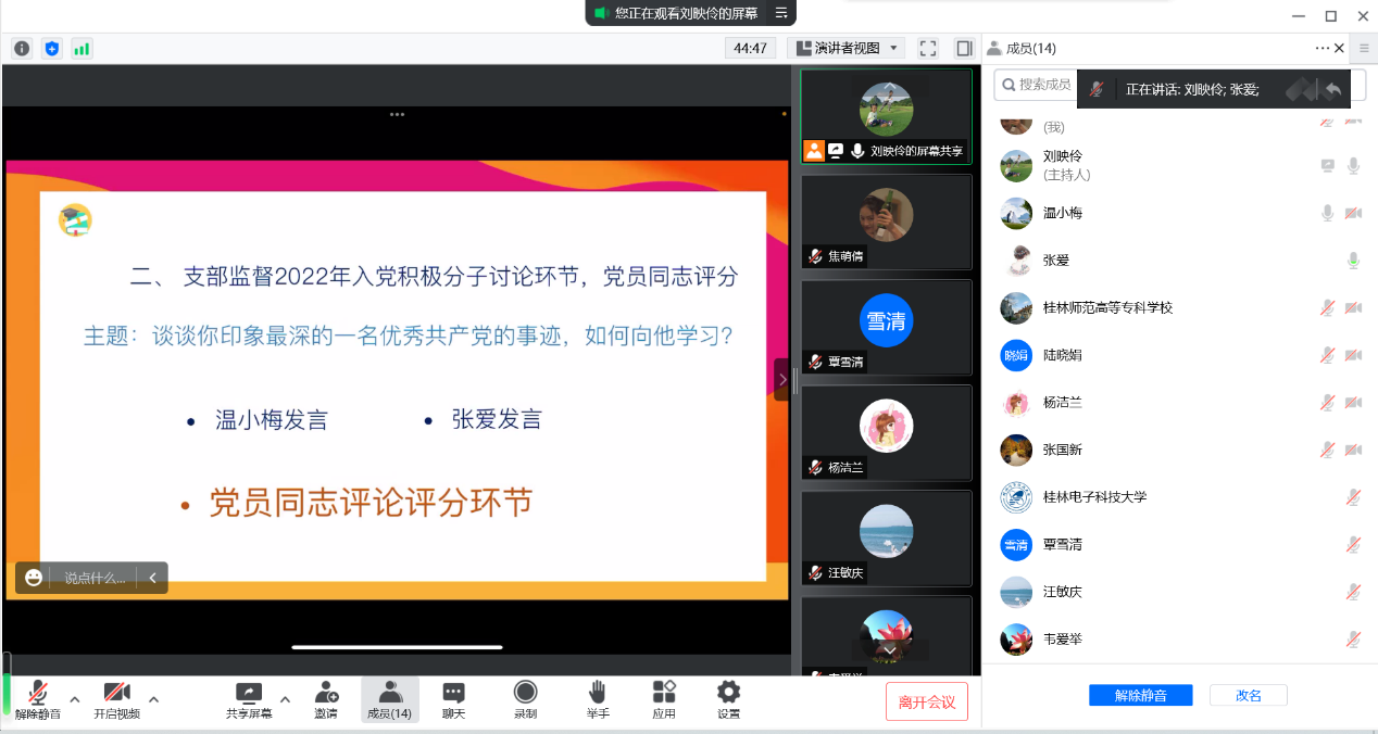 为了贯彻落实学校党委关于“三会一课”要求,进一步了解2022年支部入党积极分子思想动态,充分发挥其主观能动性,数学教研部直属党支部于11月26日在腾讯会议召开党员大会。会议由支部书记刘映伶主持,支部全体党员和三名入党积极分子参加会议。