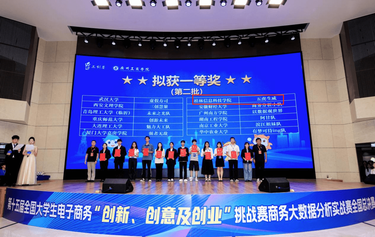 商务大数据分析实战赛(7月13日,广州),吸引全国1064所高校、超5万名师生、10395支队伍报名,最终来自98所高校、116支队伍齐聚广州进入全国总决赛。我校“五虎生威”团队以广西赛区第三名的成绩晋级国赛,并勇夺全国一等奖。该团队的两位指导老师同样获评“全国总决赛优秀指导老师”。