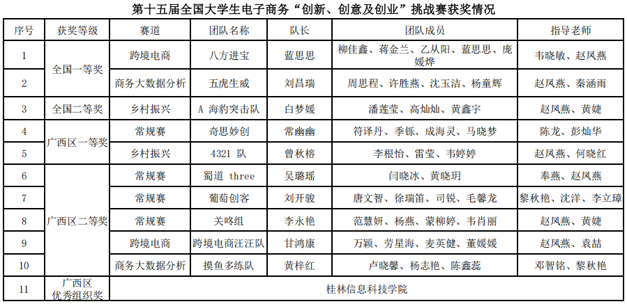 跨境电商实战赛(7月10日,杭州),覆盖全国32个省、自治区、直辖市857所高校的6486支团队踊跃报名,来自86所高校的100支精英队伍最终齐聚杭州进入全国总决赛。我校“八方进宝”团队以广西赛区第一名的优异成绩晋级,并最终荣获全国一等奖。该团队的两位指导老师同时获评“全国总决赛优秀指导老师”。