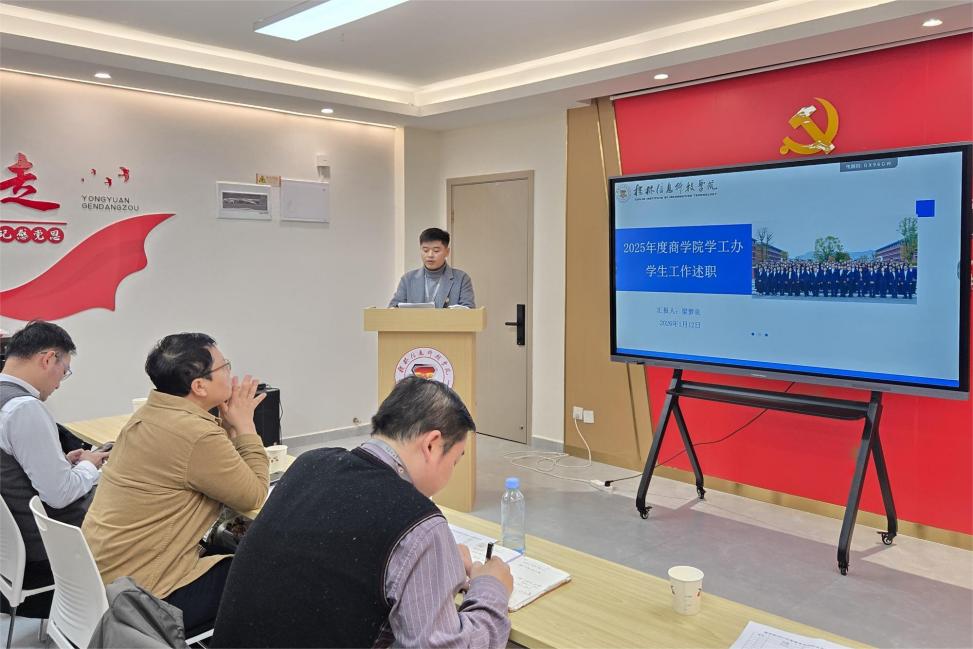 为全面总结年度学生工作成效,推进辅导员队伍专业化建设,1月12日,商学院在一站式服务中心党员活动室召开2025年度辅导员工作述职会议。学校纪委书记、校长助理周璇,学院院长周洁、学生发展与服务中心副主任蒋勇,学院全体辅导员参加会议。会议由学院党委书记许奇主持。