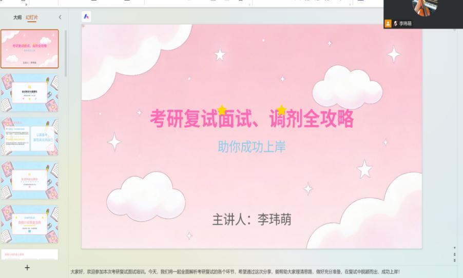 会上,谢敏雨老师围绕考研面试全流程,从复试环节解析、专业素养展现、面试礼仪规范等方面进行细致讲解,建议考生提前梳理个人材料,在面试中突出逻辑思维与专业应答能力,并结合近年复试形式变化提出针对性备考建议。李玮萌老师聚焦面试技巧与调剂策略,围绕自我认知、复试准备、调剂政策解读、信息搜集渠道、院校选择等五个维度进行系统分享。两位老师的讲解深入浅出,为同学们提供了清晰的备考思路,帮助大家全面了解复试流程与调剂政策,增强了应对挑战的信心。