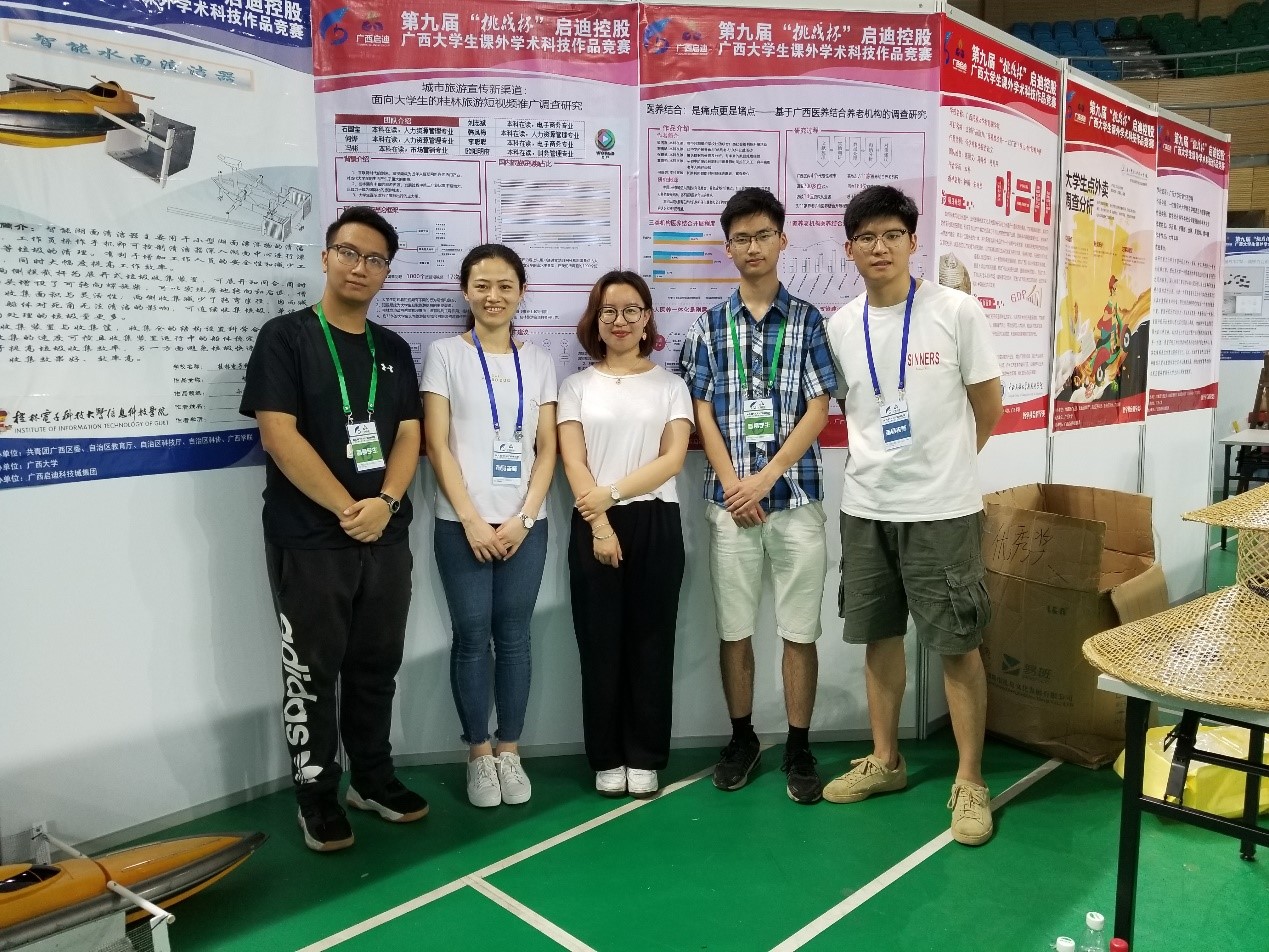 5月27日,由共青团广西区委、自治区教育厅、自治区科技厅、自治区科协、广西学生联合会联合举办的第九届“挑战杯”启迪控股广西大学生课外学术科技作品竞赛终审决赛在广西大学举行。管理系主任严宗光教授、人力资源管理教研室主任周文彬老师带领并指导的养老机构调查小分队由我系梁洛嘉、刘雨晗、张雄武、覃唯帅、何泓树五位同学组成,凭借作品《医养结合:是痛点更是堵点——基于广西养老机构的调查研究》荣获区赛一等奖。
