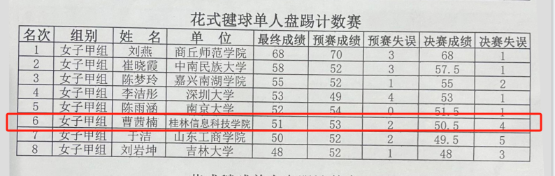 据悉,本次比赛分甲、乙、丙3个组别,设毽球、平踢毽球、花毽3个大项共20个小项。我校体育健儿曹茜楠凭借自身实力、努力拼搏的精神,最终斩获了花式毽球单人盘踢女子甲组全国第六的好成绩。【体育与健康学院 刘卓】