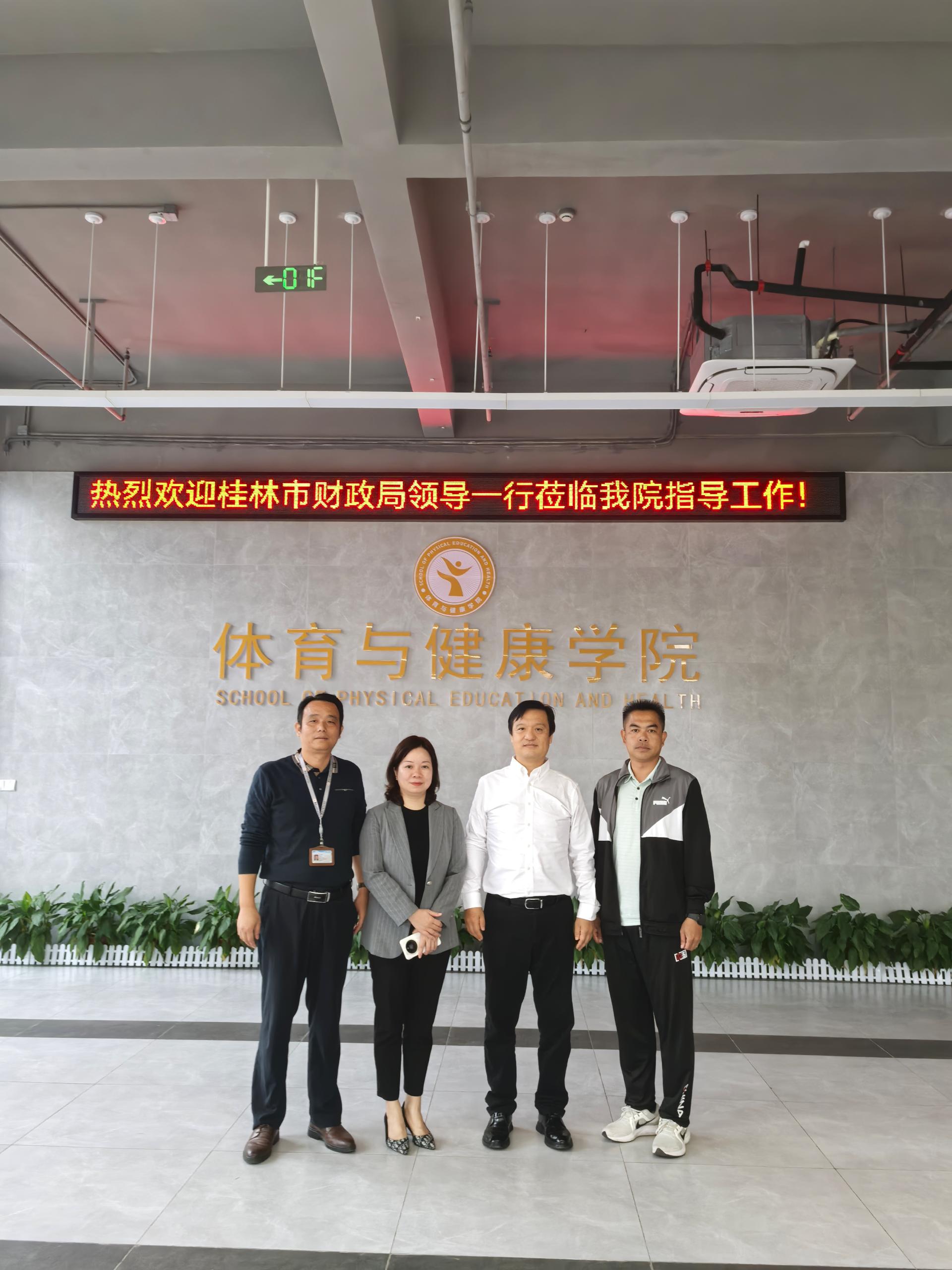 10月30 日上午,桂林市财政局副局长贺正蓉、赵卫到体育与健康学院调研筹备桂林市财政系统趣味运动会赛事工作,院长周勇、党总支书记关永康参加调研活动,双方初步达成互帮互助意向,保障此次赛事顺利进行。【体育与健康学院 刘卓】