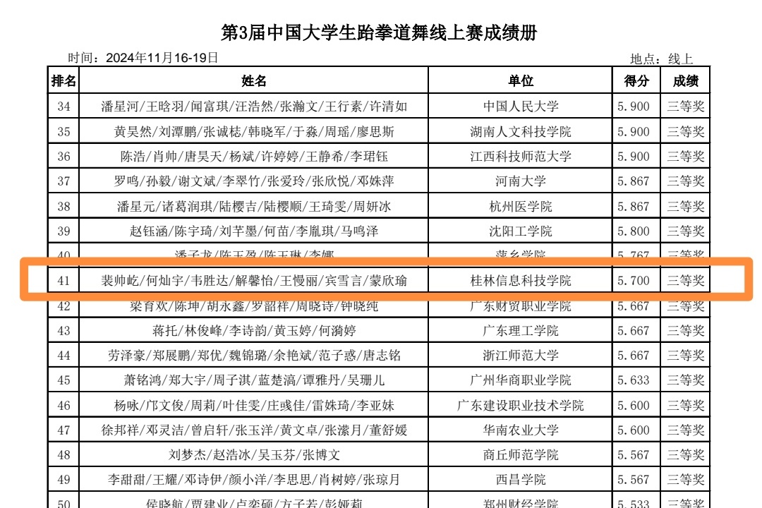 据悉,本次比赛共有来自全国各地92所高校,1000多名选手参赛。我校跆拳道代表队在比赛中坚韧不拔、合作互助,展示良好的赛场风格和奋发有为的精神面貌,最终荣获三等奖的佳绩。【体育与健康学院 刘卓】