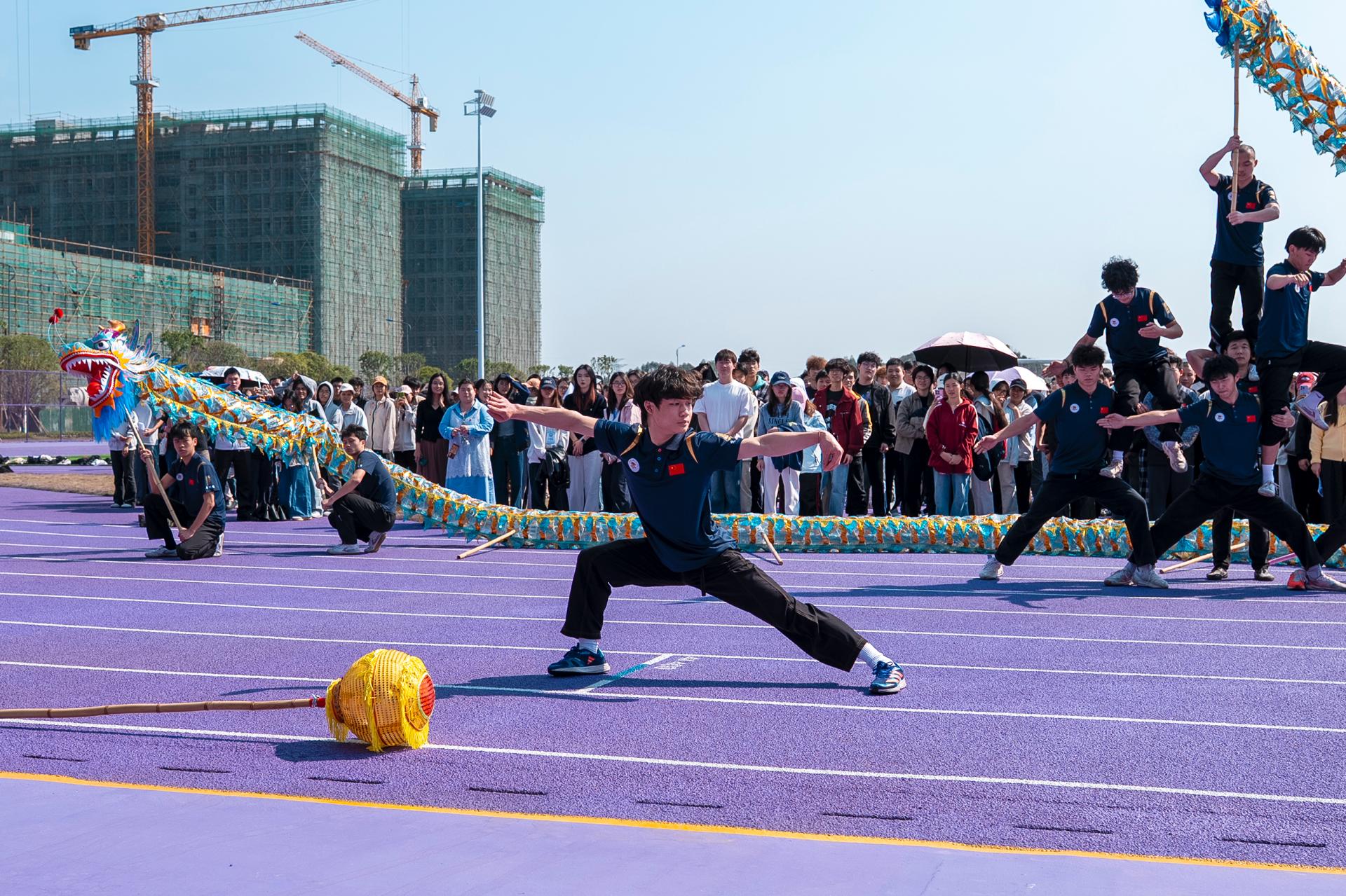 仪式暖场环节,体育与健康学院师生带来舞龙、舞狮和八卦大刀表演。启用仪式中,甘勇书记宣布:桂林信息科技学院二期校区体育场正式启用!并向参与体育场建设、筹备工作的全体人员致以诚挚谢意。同时勉励全体师生以体育场启用为契机,积极参与体育锻炼,发扬体育精神,在运动中强健体魄、砥砺品格,以饱满的精神状态投入到学习、工作与生活中。随后,党委副书记李飞为本次启用仪式的足球友谊赛进行开球。
