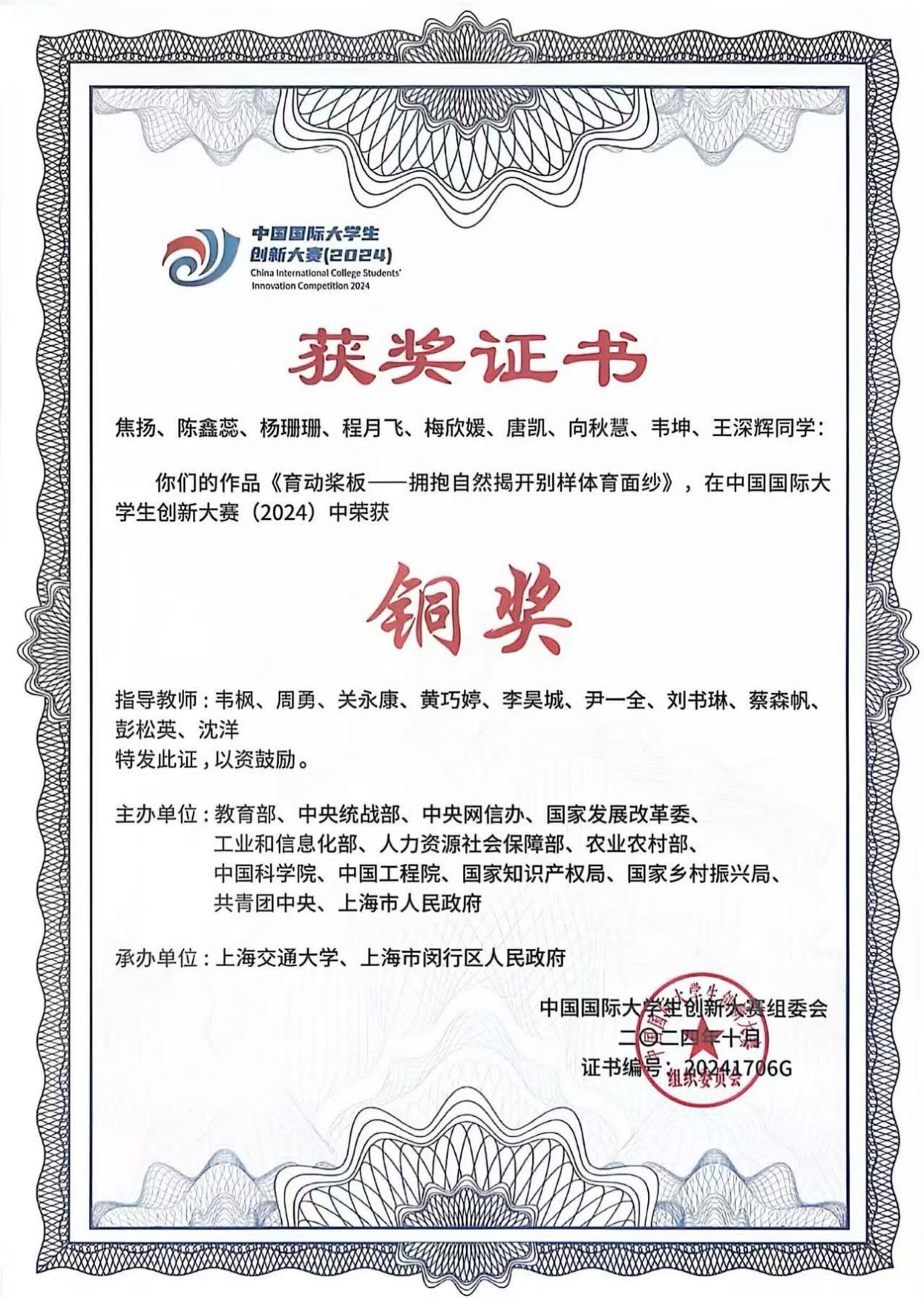 《育动桨板-拥抱自然揭开别样体育面纱》中国国际大学生创新大赛(2024)荣获铜奖