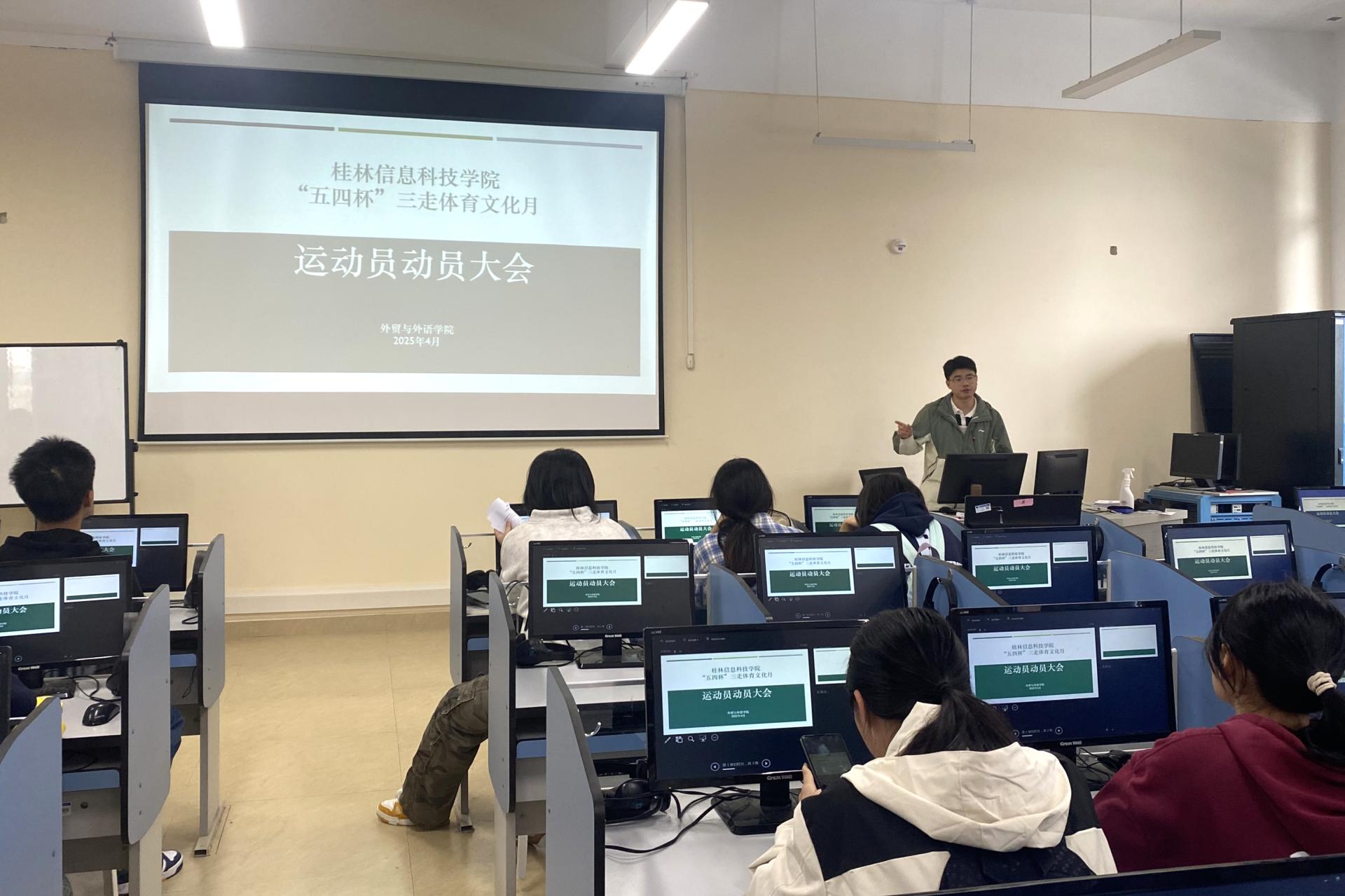 为迎接我校“五四杯”三走体育文化月的到来,4月7日中午,外贸与外语学院在F101召开了运动员动员大会。此次大会由学院团委负责人刘冲主持,学院学工办主任杨锦超出席,为即将参赛的运动员们加油鼓劲。