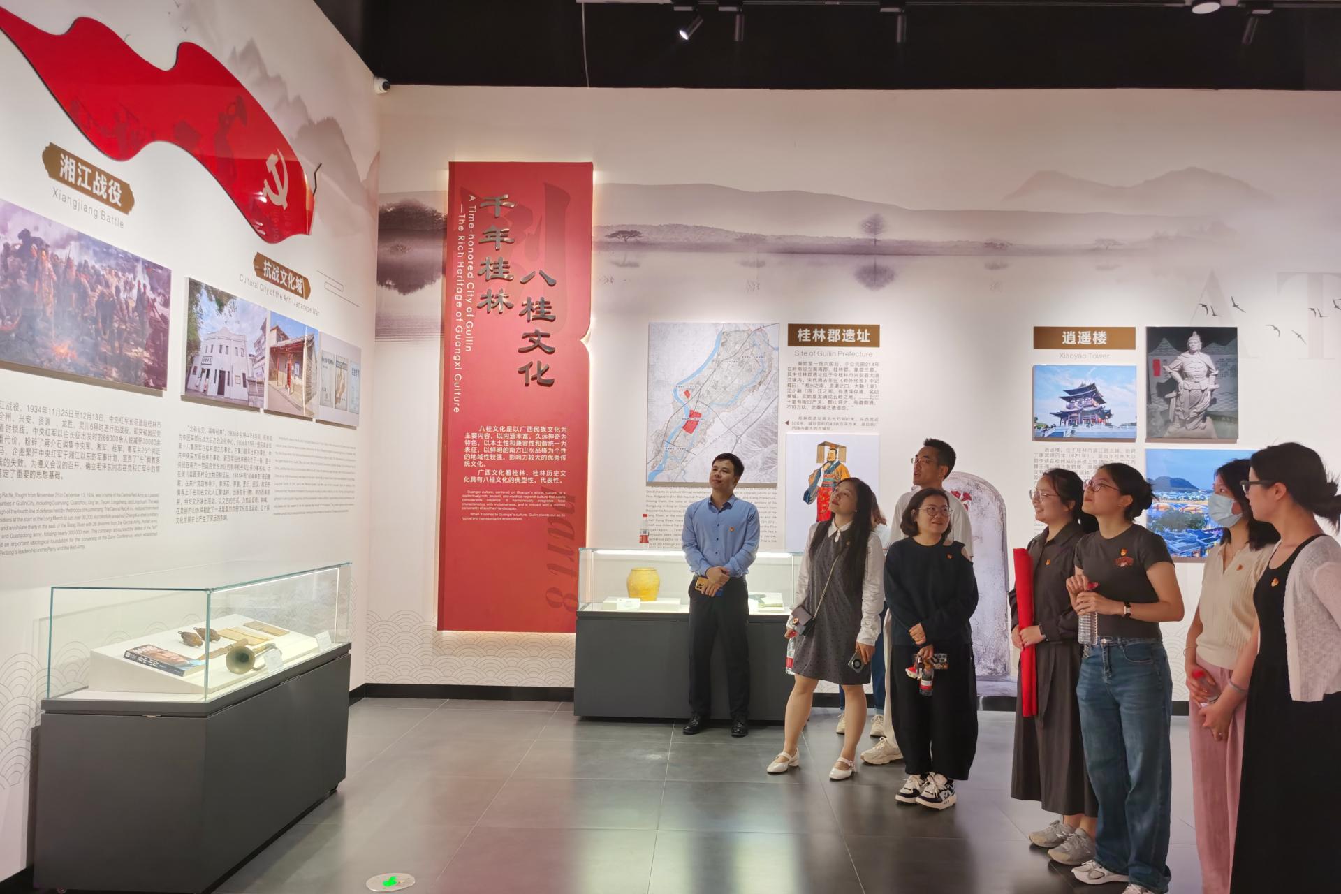 本次活动聚焦“双语党史学习教育”与“桂林抗战文化挖掘”两大主线。活动当天,支部党员教师主要参观袭汇艺术馆的红色历史展厅,通过双语宣传展板,全面系统地学习了红军长征过广西的壮烈历程,了解到桂林作为抗战文化中心的独特历史地位。同时,通过学习红色历史展厅内的中英双语党史故事,了解双语故事的历史背景,比较中英双语党史词汇不同表达与文化差异,理解和思考党史背后蕴含的深厚文化内涵,进一步促进了支部党员教师形成对党史革命故事的国际传播意识,也是一次思想与专业的 “双重淬炼”。参观后,全体党员教师都表示将从党史中汲取精神力量,努力在今后的工作中转化为育人实践,在课堂教学中有机融入双语党史与红色故事,传承红色基因,培养学生的家国情怀与国际视野。