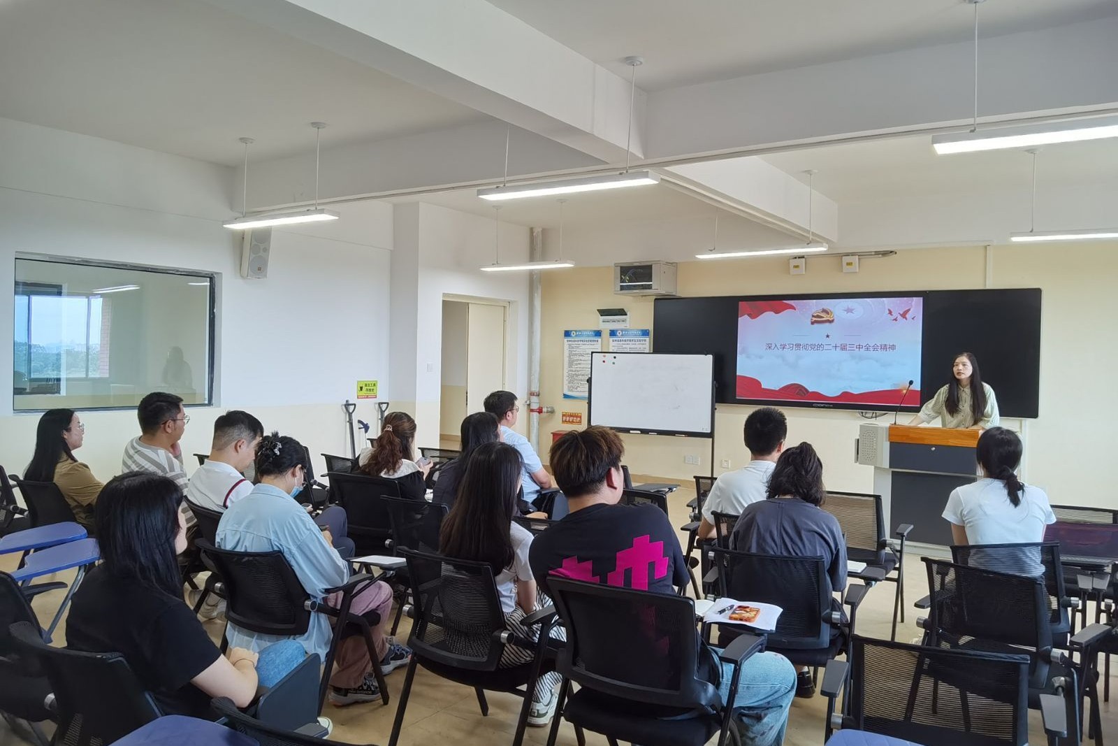 为深入学习贯彻党的二十届三中全会精神,全面了解和学习党的最新理论方针政策,加强师德师风建设。6月12日,外贸与外语学院第一教工党支部在L508召开党员大会。