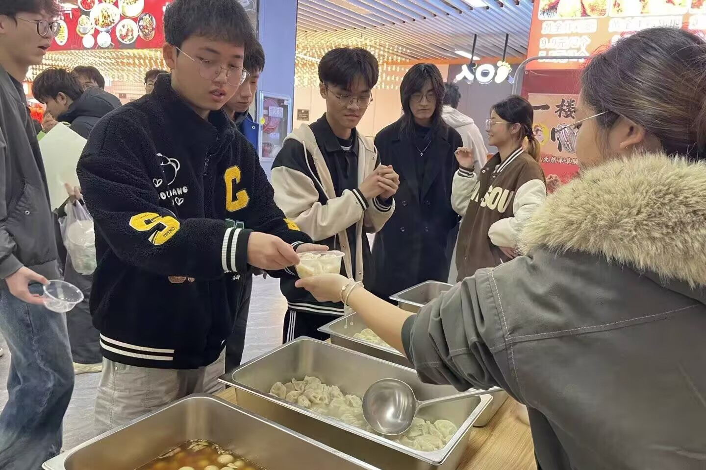 为让青年学子在传统文化浸润中厚植文化自信、拓宽国际视野,2025年12月19日12:00,由外贸与外语学院团委主办,国际交流协会承办、英语协会协办的 “冬至聚,‘饺’朋友”主题活动,于学校食堂一楼温情启幕。