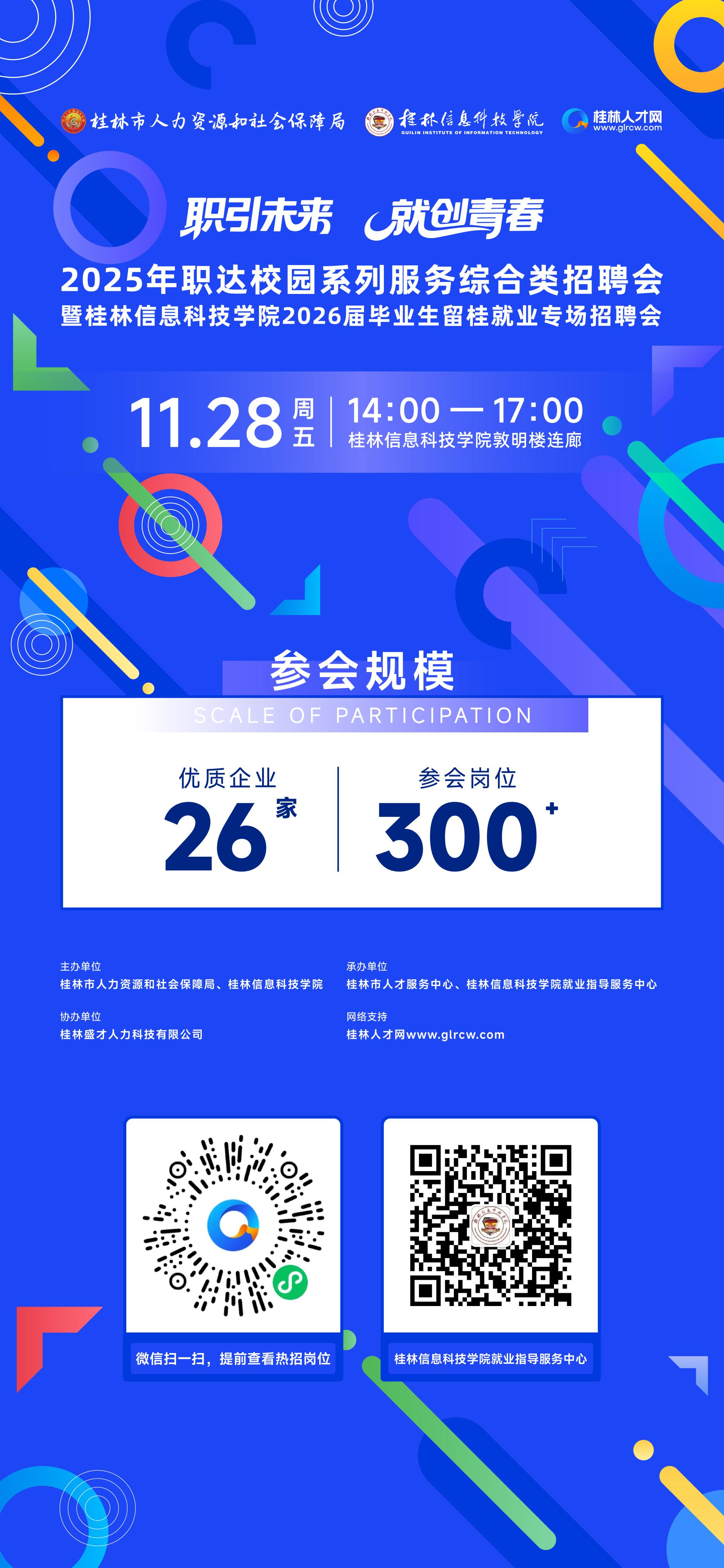 为搭建毕业生与用人单位之间的高效供需平台,我校定于2025年11月28日举办2026届毕业生留桂就业专场校园招聘会。现将有关事项通知如下: