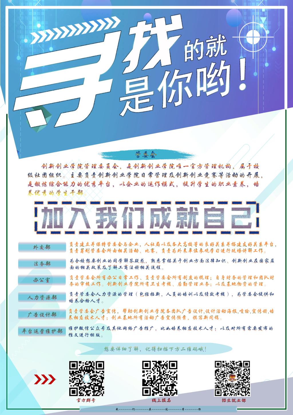 创新创业学院管理委员会,是创新创业学院唯一官方管理机构,属于校级社团组织。主要负责创新创业学院日常管理及创新创业竞赛等活动的开展,是学生综合能力的优秀平台,以企业的运作模式,提升学生的职业素养,培养优秀的学生干部。
