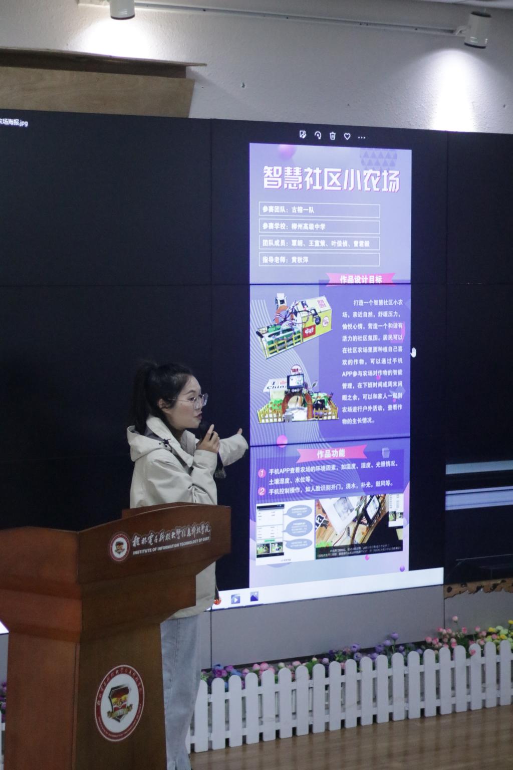 会上,广西科技馆科技辅导员罗柠米围绕大赛“智慧社区”主题,对大赛高校组“创意作品”赛道进行了解读并分享往届参赛经验,她鼓励学生围绕家居生活、社区服务等方面,发现生活中的实际问题,并利用人工智能、物联网相关技术创作作品,解决问题,实现既定目标,突出发现和解决实际问题的能力。宣讲结束后,两位宣讲老师与参会选手代表进行了现场问答互动,特别针对团队报名、选手选拔、队伍备赛、作品参赛等疑问进行了一一解答,让同学们更加清楚并了解了大赛,也为今后持续推进学校青年科普工作打下了基础。