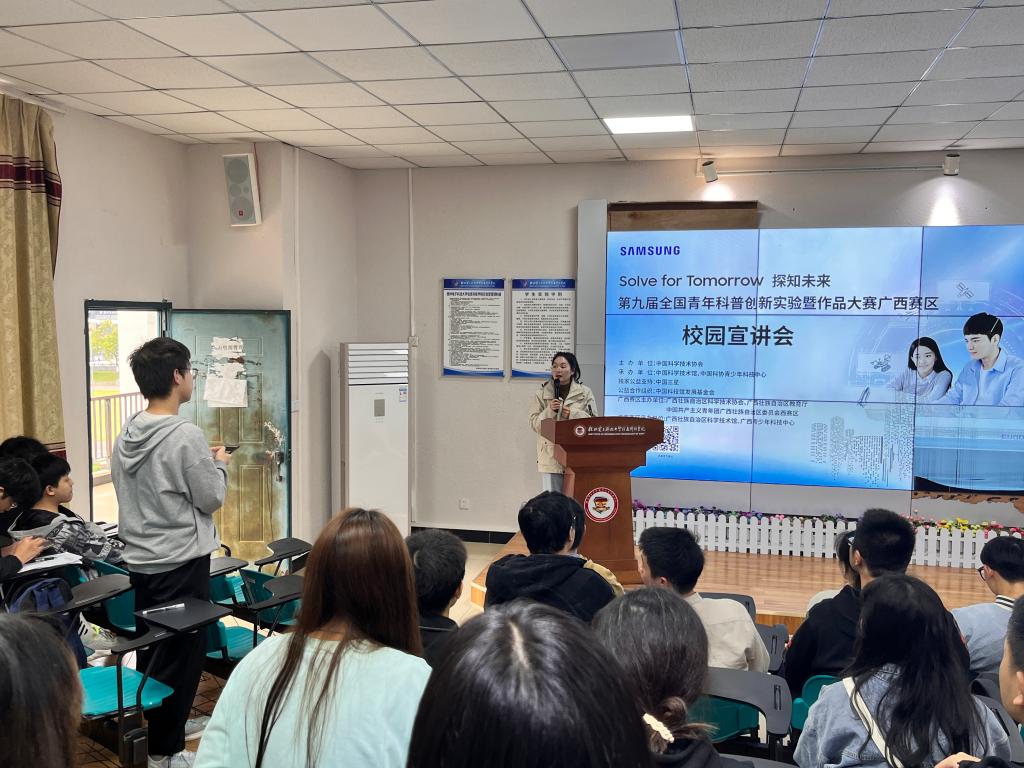 为了进一步激励广大青年学生参与科普创作和实践,促进科学思想、科学精神、科学方法和科学知识的传播和普及,提高广大青年学生的创新创造能力。3月31日下午,广西科技馆应邀专派罗柠米、黄芳两位科技辅导员来我校11408报告厅开展“第九届全国青年科普创新实验暨作品大赛”宣讲会。全国青年科普创新实验暨作品大赛是一项面向青年学生的全国性科普赛事,我校经过周密组织,共有37支参赛队选手代表及相关专业指导老师参会。