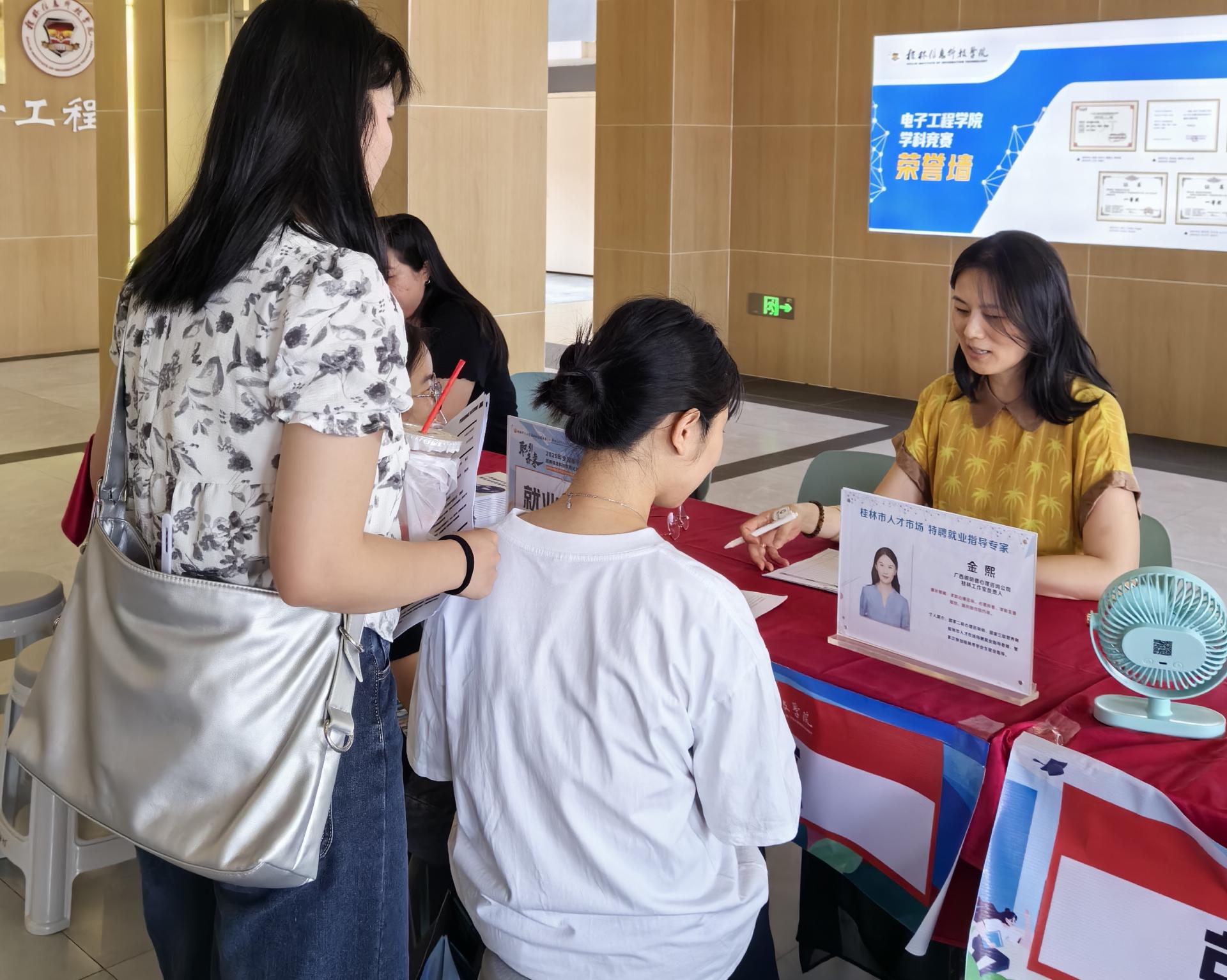 为给毕业生提供全方位支持,会场特设了“就业指导与简历诊断专区”和“就业政策宣传专区”,并特邀桂林市人才服务中心代表及资深人力资源专家坐镇,提供“一对一”精准咨询。专家们就简历优化、面试技巧、职业规划等痛点问题为同学们答疑解惑;人才服务中心代表则对最新就业政策进行了权威解读。这一贴心服务赢得了学生们的一致好评。“专家的指导一针见血,让我对如何修改简历、应对面试有了更清晰的方向!”一位来自电子工程学院的王同学兴奋地表示。