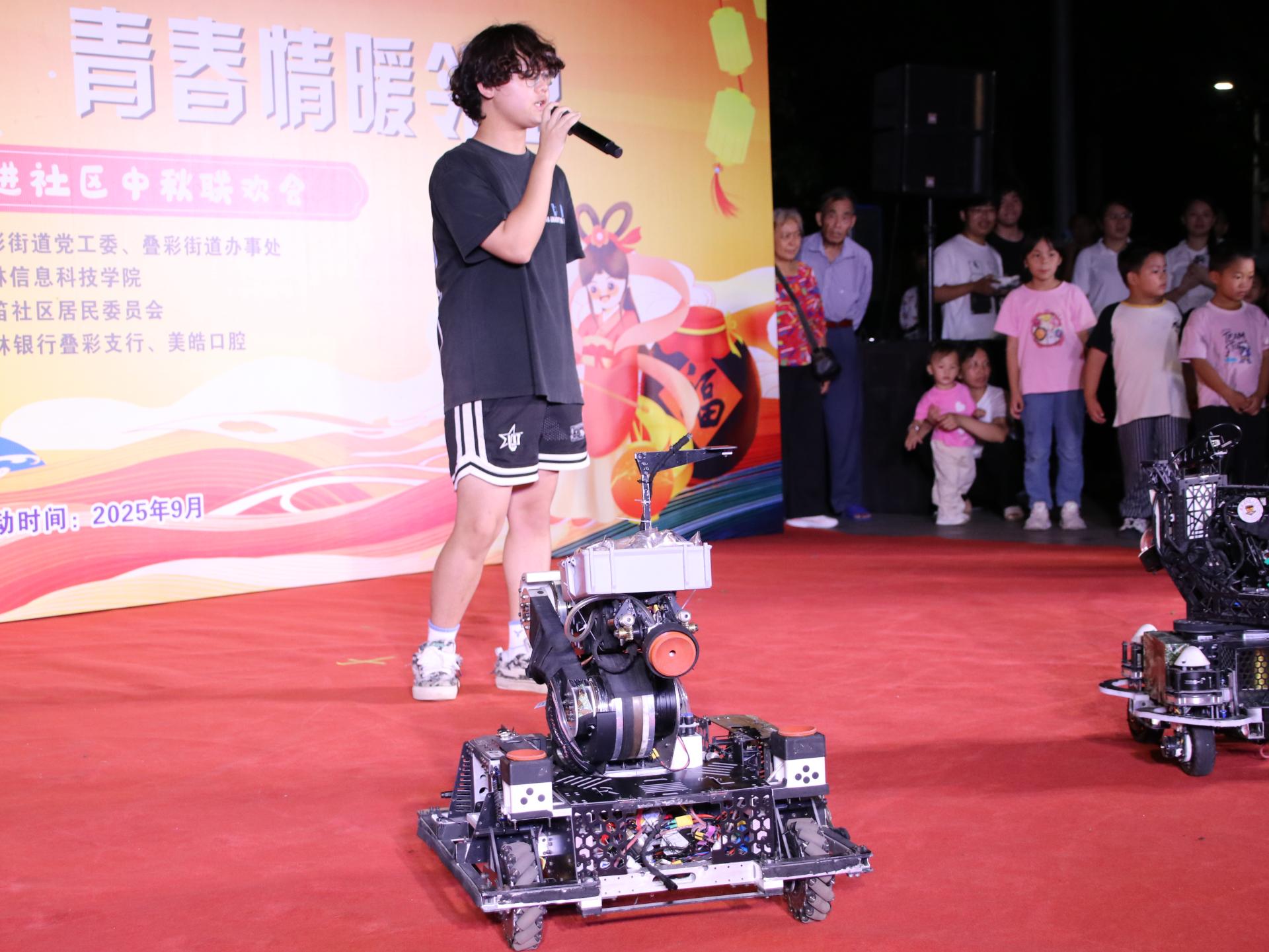 学校GIRT机器人战队带来的机器人成为全场焦点,四台造型独特的机器人通过灵活的走位、精准的操作,完成了一系列指定动作,引得现场观众阵阵惊叹。它们还化身“祝福派送员”,为现场社区居民递送定制月饼。当机器人缓缓靠近,将月饼送到居民手中时,现场爆发出一阵热烈的欢呼声,将活动气氛推向了最高潮。