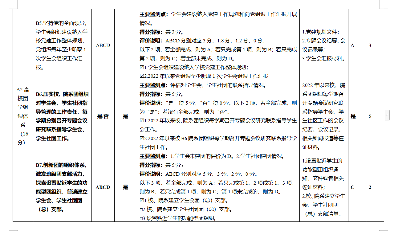 1.在共青团方面。在学校党委领导下,构建“一心双环”组织格局,以团委为核心和枢纽,以学生会为学生自我服务、自我管理、自我教育、自我监督的主体组织,以学生社团及艺术团为外围延伸手臂,改进团组织对学生会组织的指导,推动学生会组织深化改革,依法依章程独立自主开展工作,各二级学院学生会组织,由同级团委归口指导。校团委履行对学生社团的主要管理职能,支持引导学生社团规范发展,学生会组织配合团组织加强对学生社团的引导、服务和联系。落实和完善团的代表大会制度,严格执行校级和院级团的代表大会定期召开制度,学校团代会3-5年召开一次,院级团代会2-3年召开一次,坚决杜绝不按时召开的现象,截止目前各二级学院团代会均按期规范进行换届,校级团代会因疫情原因,根据学校党委要求推迟到2023年上半年召开。加强团员教育管理,根据《新时代共青团员先进性评价指导大纲(试行)》文件要求开展团员先进性评价工作,覆盖率达100%。认真落实基层团组织规范化建设要求,依托“智慧团建”系统,扎实做好毕业学生团组织关系转接工作,目前我校学社衔接发起率达100%,转接完成率达100%。规范开展“三会两制一课”、利用重要节日和时间节点开展主题团日活动。